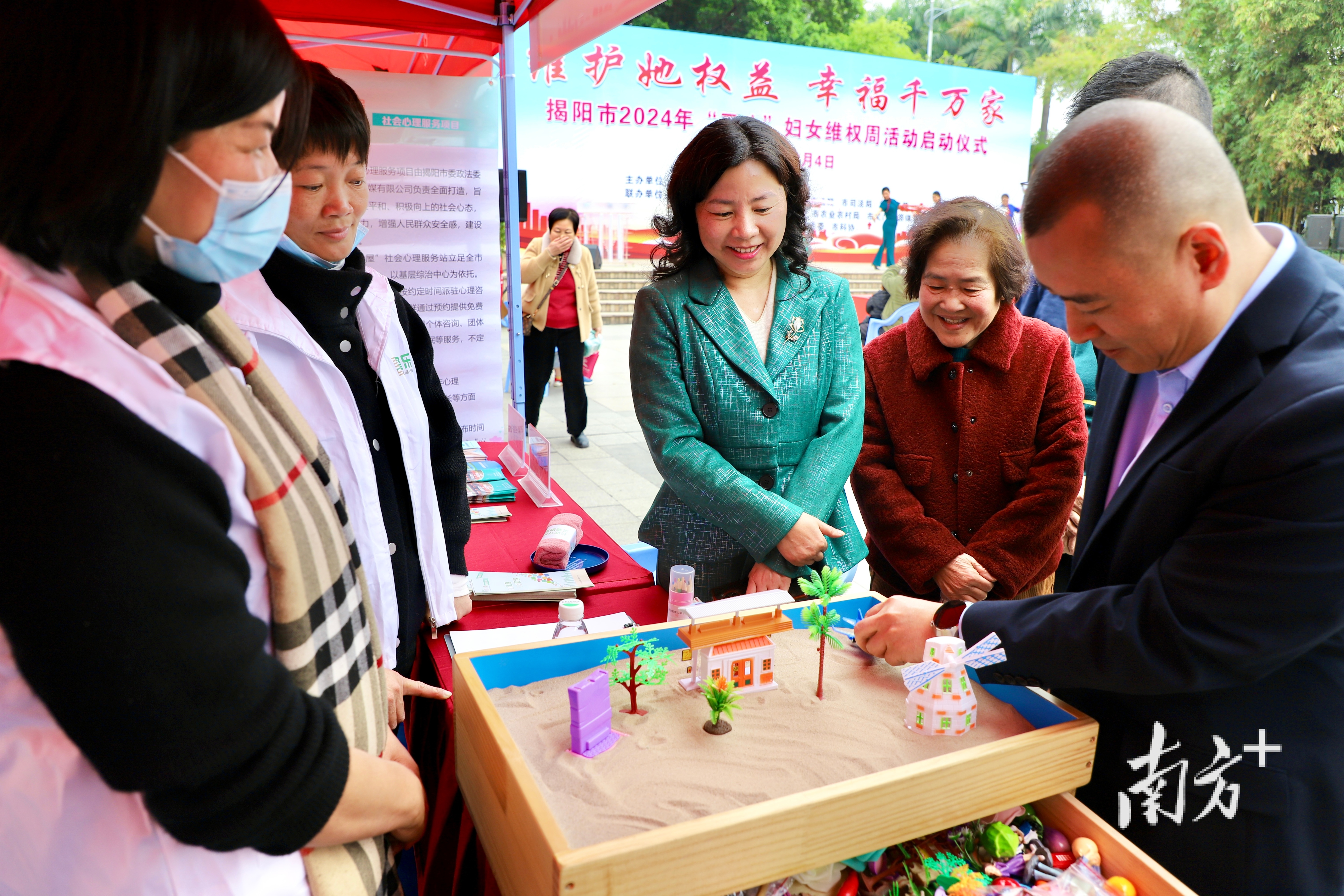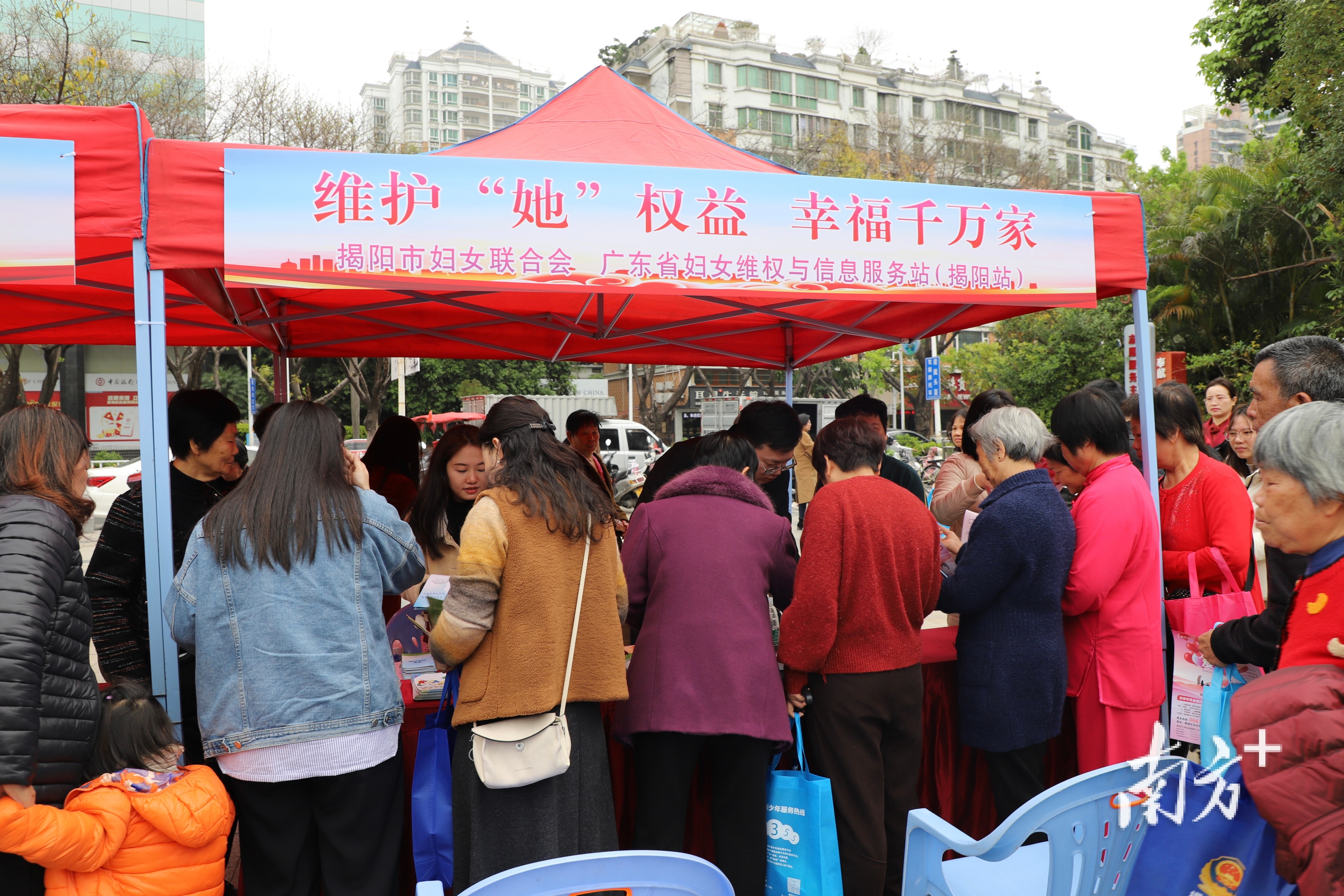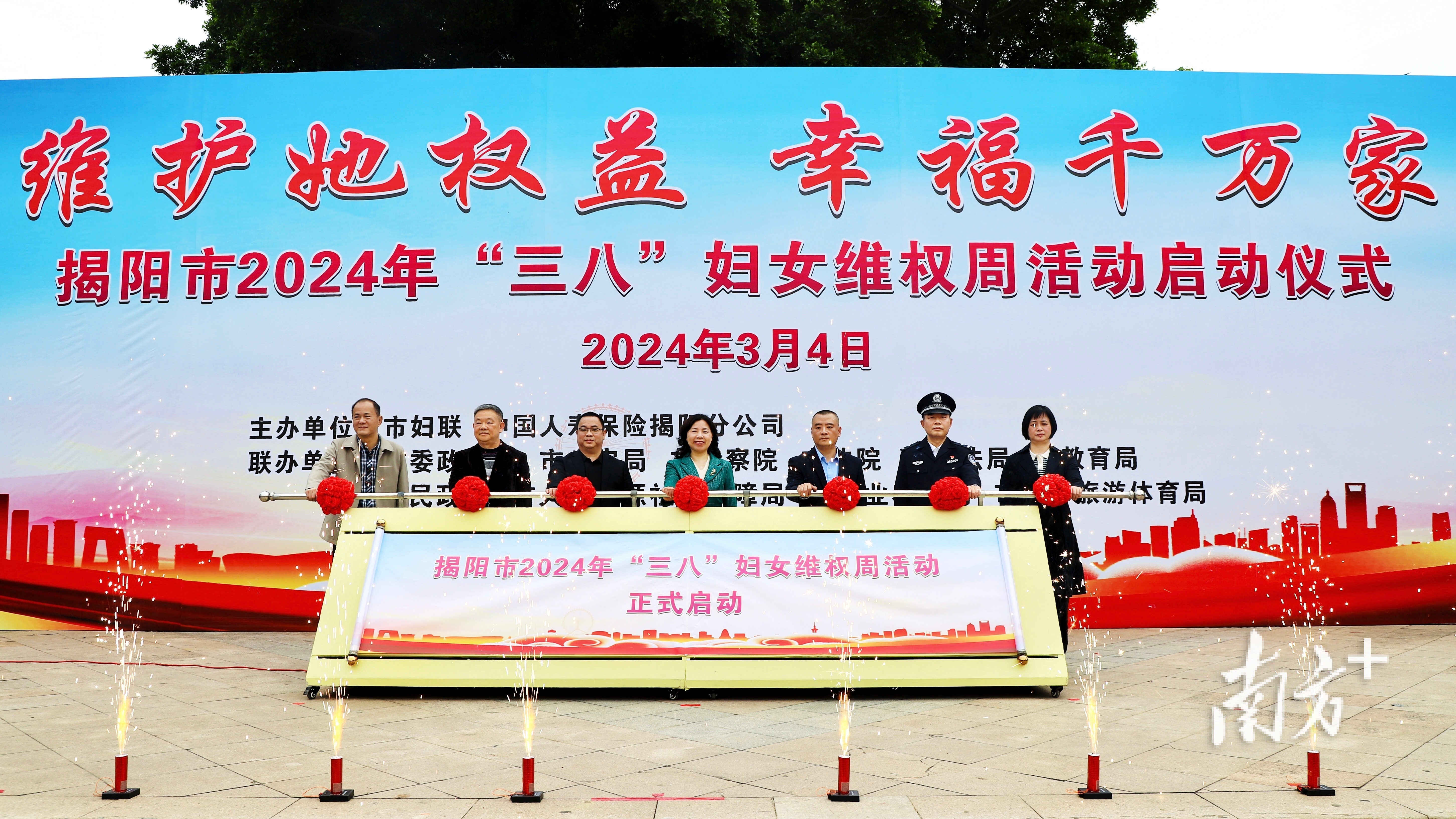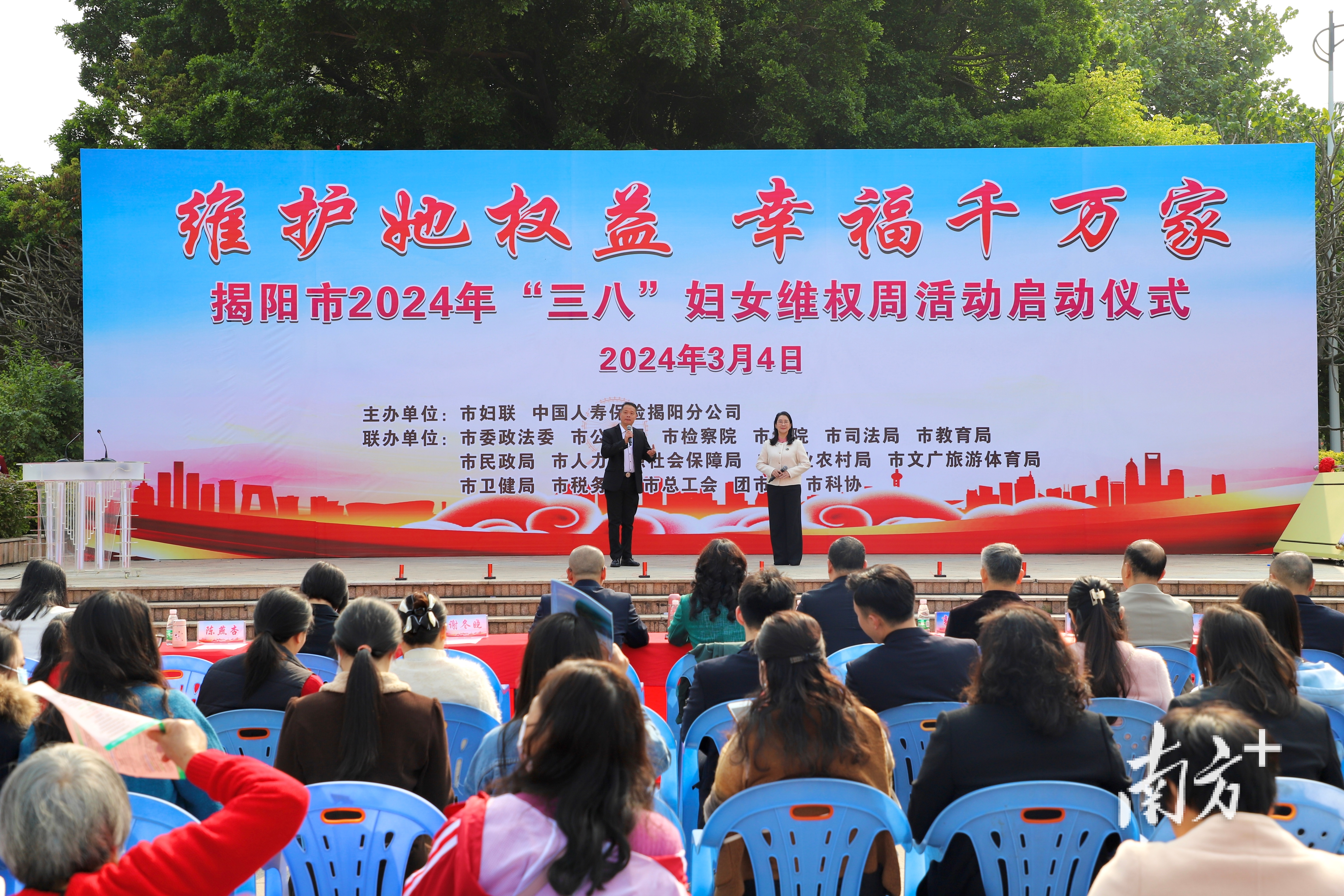 为提升妇女干部服务群众能力,引导广大妇女群众和家庭尊法学法守法用法,提高法治素养,3月4日上午,揭阳市妇联、中国人寿保险揭阳分公司联合市委政法委、市公安局、市检察院、市法院、市司法局等十七个部门,以“维护她权益 幸福千万家”为主题,在揭阳市青年文化广场举行揭阳市2024年“三八”妇女维权周启动仪式。副市长许剑芒,市妇联党组书记、主席蔡桂君,中国人寿保险揭阳分公司总经理陈大彦和市直有关部门领导参加活动。
