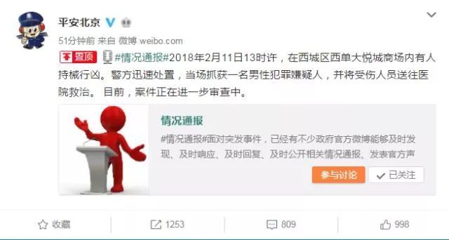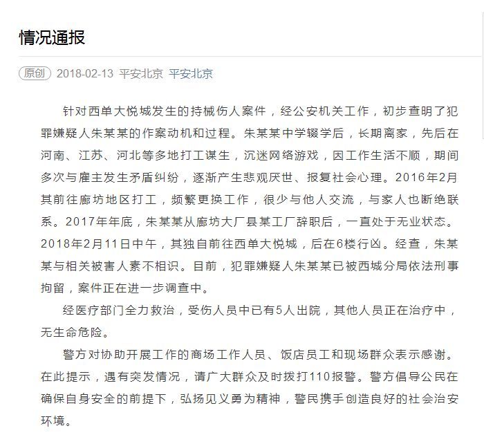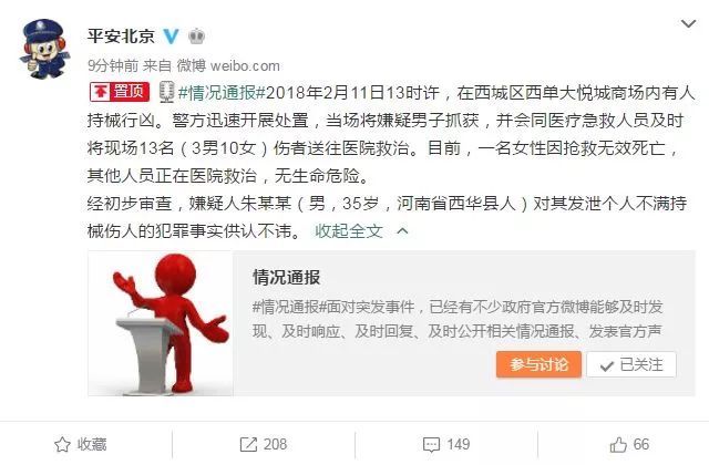 针对北京西单大悦城持械伤人案,北京警方2018年2月13日凌晨零点发布情况通报。全文如下↓