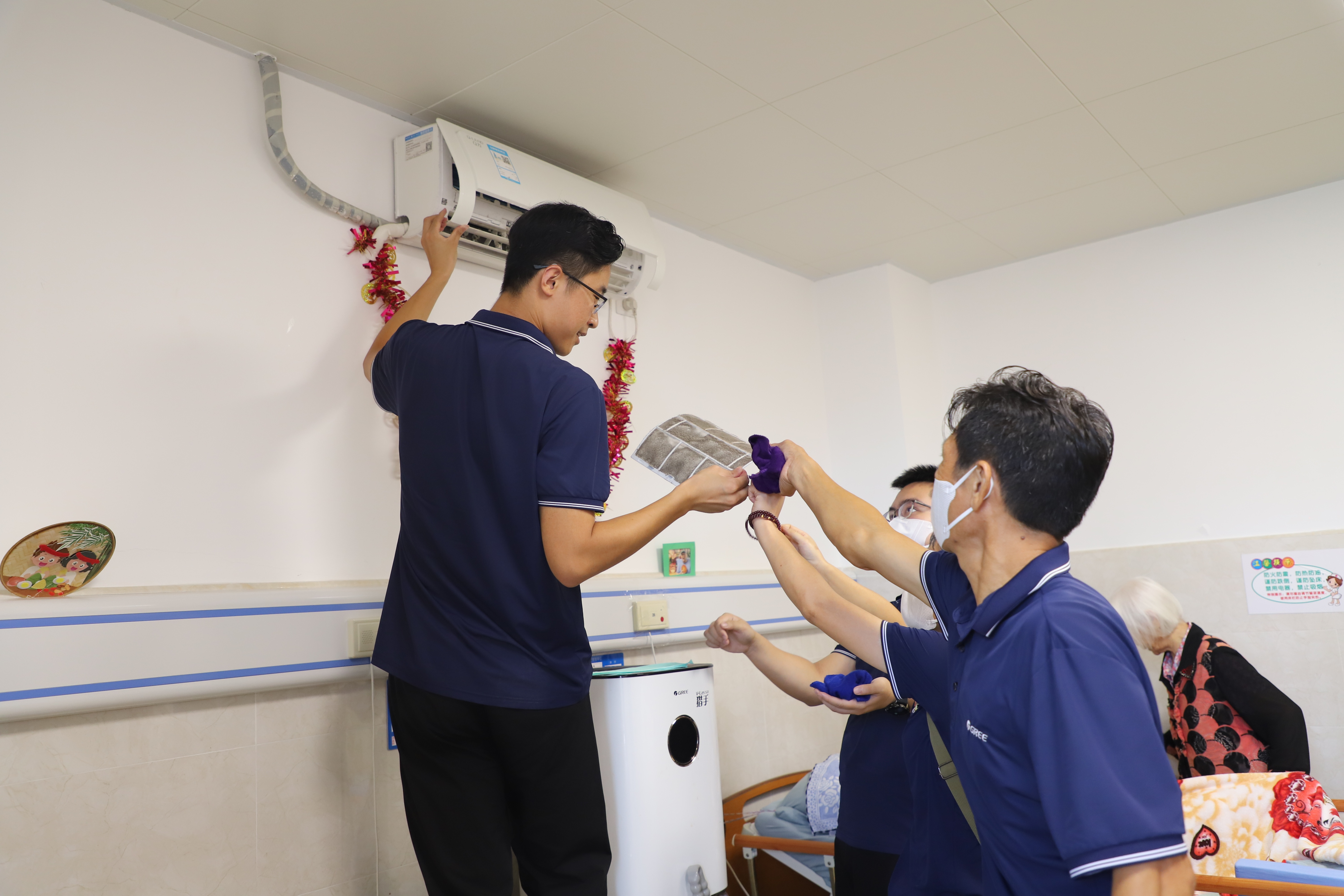 志愿者们则帮助打扫了走廊等公共区域卫生,并发挥专业优势,帮助清洗20余台空调。