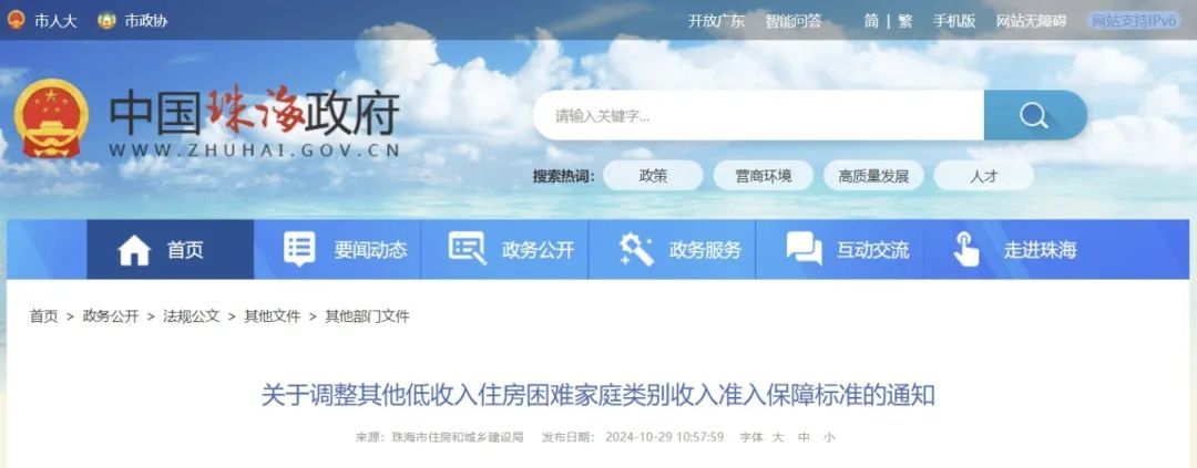 近日,珠海市住房和城乡建设局发布《关于调整其他低收入住房困难家庭类别收入准入保障标准的通知》(以下简称《通知》)。