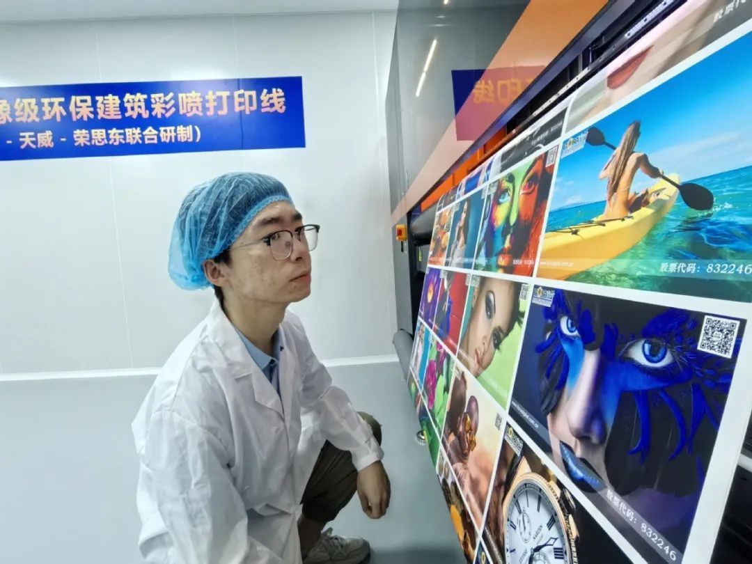 当天,由荣思东公司与珠海天威集团、深圳润天智集团联合研制的全球首条影像级环保建筑彩喷打印线,正在进行产品打印展示。据现场工作人员介绍,该生产线打印的画面像素可达600×3600dpi,且具有耐受日晒雨淋不易脱色的优点。