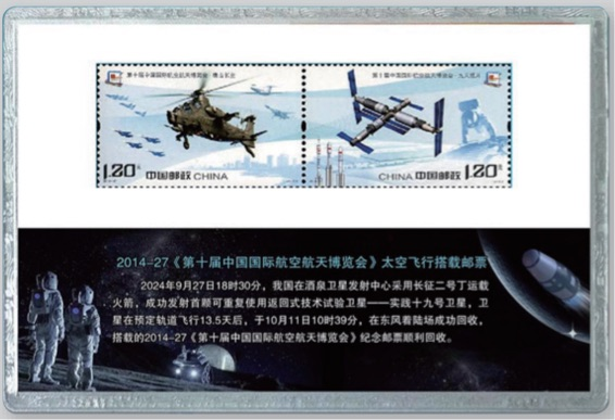 2024年9月27日18时30分,国内首颗可复用返回式技术试验卫星“实践十九号”发射成功,在轨飞行13.5天后返回地面。2套邮票以及《第15届中国国际航空航天博览会纪念邮戳卡》戳样,搭乘并进行了太空航行,也顺利完成回收。