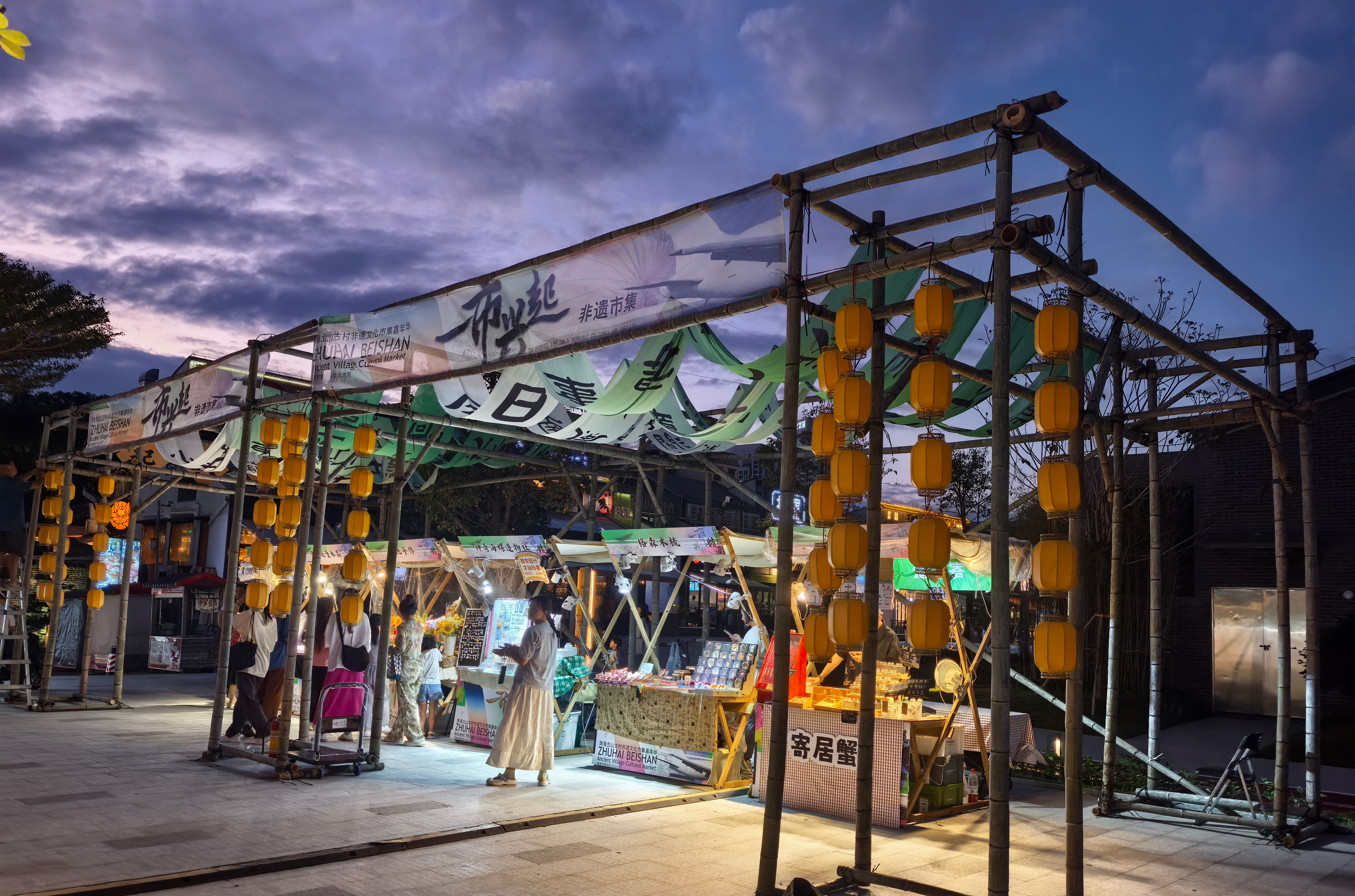 竹排门楼悬挂着飘逸的传统书法画布,精致的纸灯笼随晚风摇曳,古色古香的传统市集传递着历史韵味……