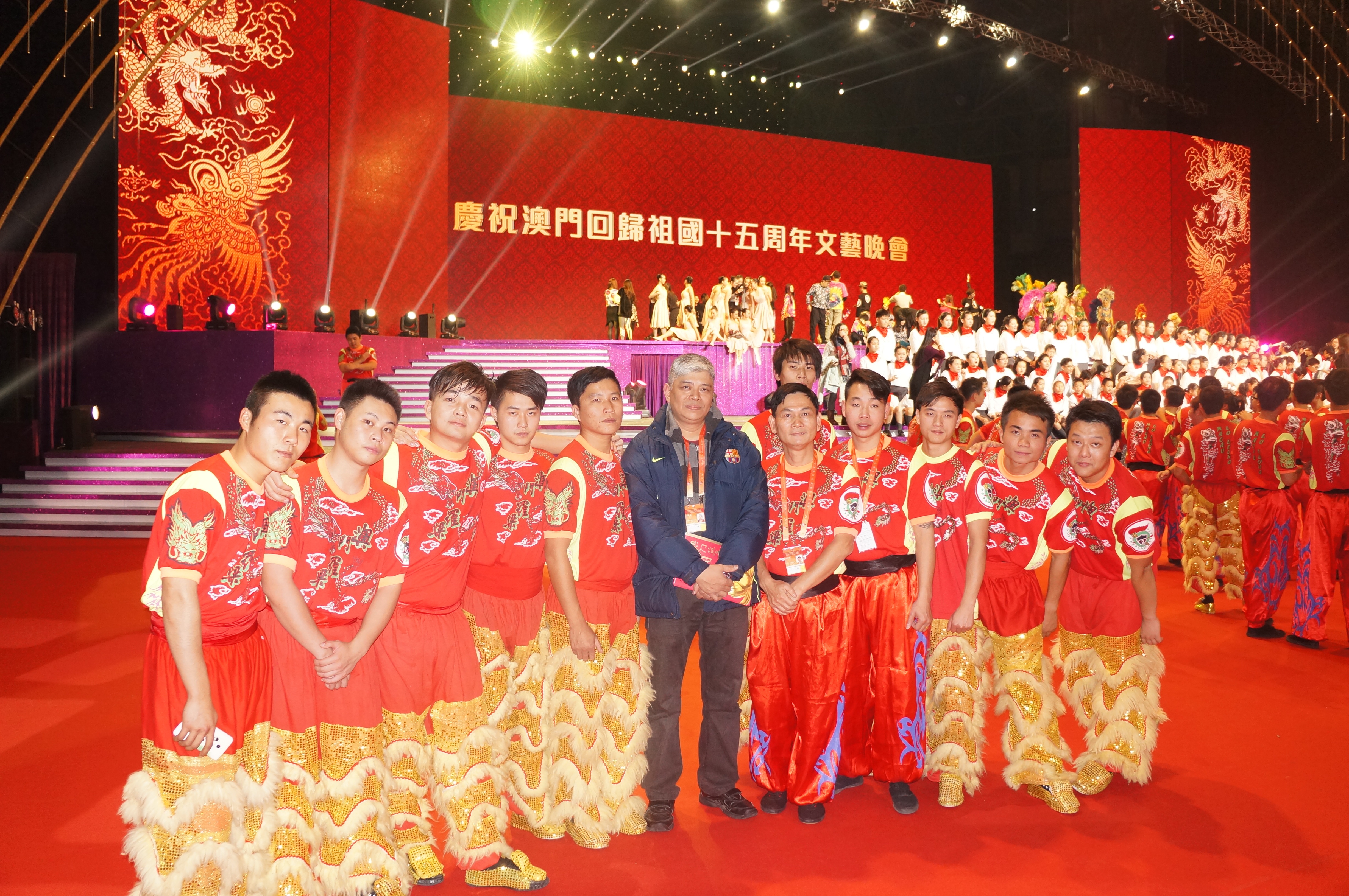 2014年12月19日晚,庆祝澳门回归祖国十五周年文艺晚会在澳门东亚运动会体育馆上演,压轴好戏《腾龙盛世》龙狮、武术表演将晚会推向了高潮。龙狮表演由澳门罗梁体育总会担纲,其中醒狮队的10名队员来自斗门罗梁体育会,陈柏坚担任领队。