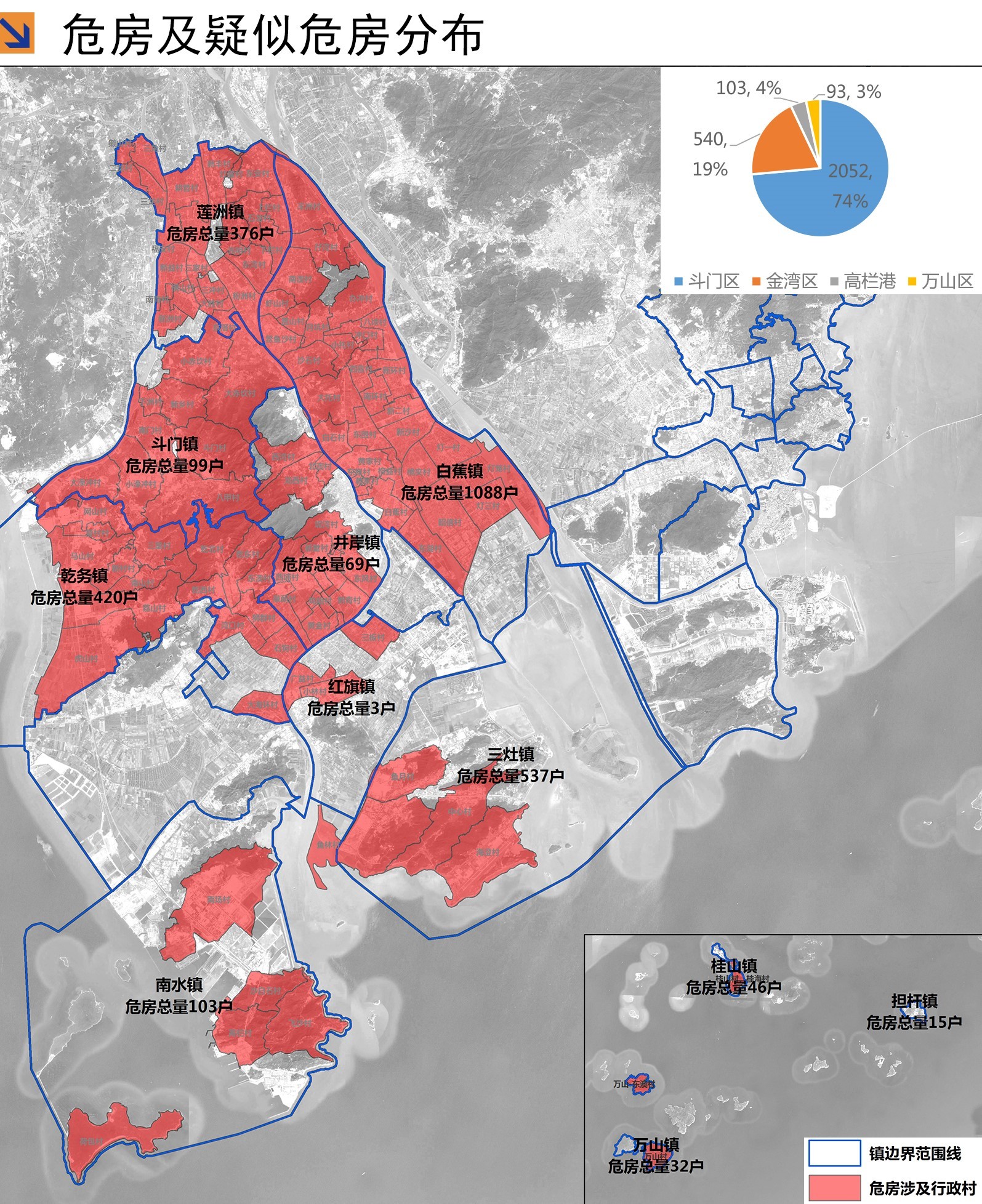 公示的规划文件显示,目前珠海市农村危房和疑似危房名单共计2788户,涉及4区12镇118村。其中,斗门数量最多,分布较广,共涉及98村2052户;金湾区数量次之,共540户,集中分布在三灶镇;高栏港和万山区数量相对较少。