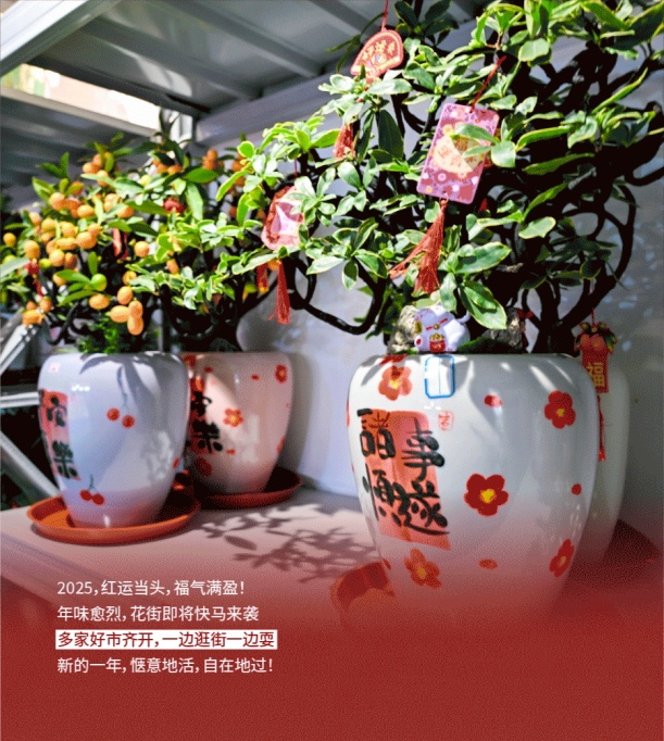 2025优特汇·花田喜市,在优特汇南侧广场区域举办,将持续至2月2日(大年初五),其中包括年货置办、美食娱乐、迎春花市等分区,花卉盆景以中小型为主。