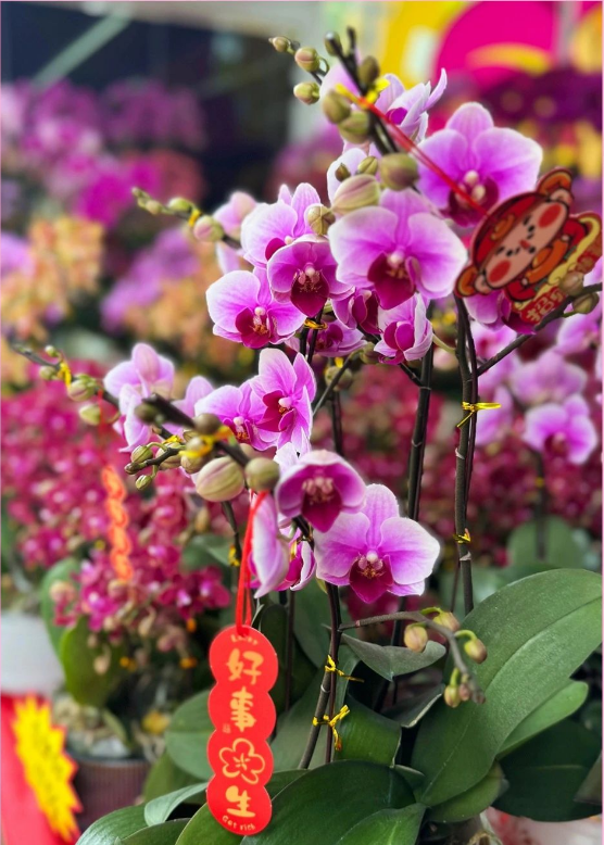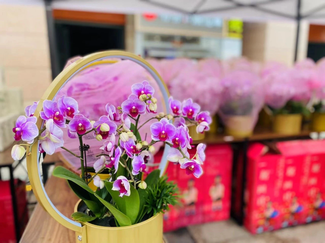 斗门大信·新都汇新春花市展销超过100种花卉,其中包括金桔、蝴蝶兰等多种品种,特别是蝴蝶兰,种类繁多,价格实惠。年货摊位则提供春联、红包、灯笼、坚果糖果等丰富商品。市民可尽情选购年花年货,感受传统节日的喜悦,共同庆祝佳节。