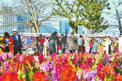 记者在现场看到,花海长廊各个城市驿站都热闹非凡。“花间集”集市热情开张,各档口前均是人头攒动;澳门艺术家写福字,为游客送上新春祝福;祈福墙前,不少游客上前摇动福铃,期望好运连连。“来到这里真的非常开心,既可赏花又可以领福字,还能摇铃祈福。”澳门陈先生特意带家中小孩来横琴体验年俗年味,希望他们能更好地学习中华传统文化。