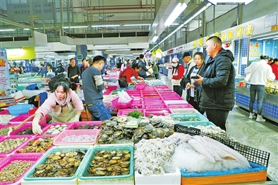 2月1日,大年初四,10时左右,市场里人来人往、买卖两旺。龙虾、九节虾、花甲王、老虎斑、大闸蟹、花螺、鲍鱼……各种海产品琳琅满目、新鲜生猛。