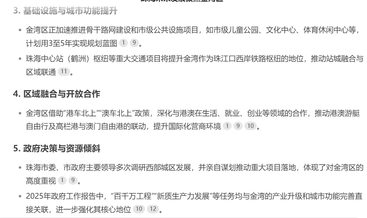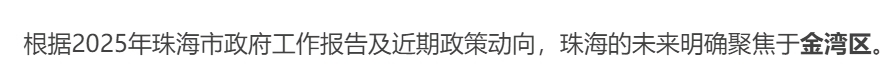 经过多维度、全方位的分析和深度思考,DeepSeek给出结论:金湾区凭借其工业基础、战略定位、政策支持和区域融合优势,被珠海市政府明确为未来发展的核心区域。其目标是成为珠海迈向万亿级城市、实现中国式现代化城市样板的“潜力所在、希望所在、信心所在”。金湾的综合性战略地位无可替代。