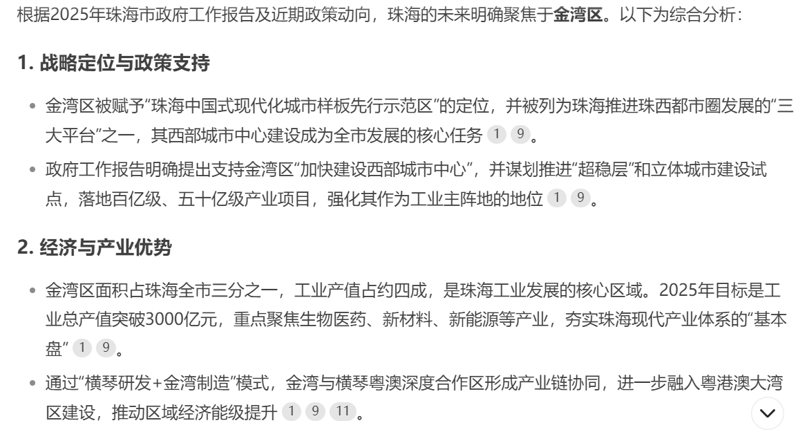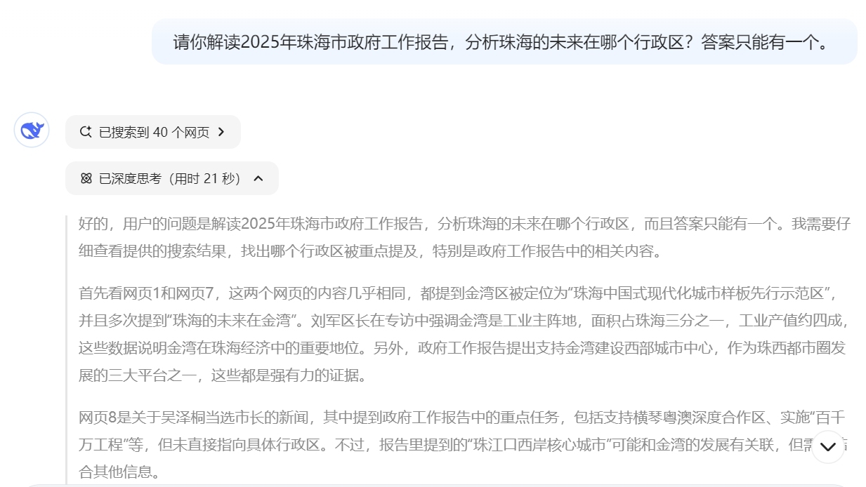 DeepSeek深度思考后说:综合来看,金湾区在工业产值、区域定位、政策支持和重大项目上都有显著优势,政府工作报告多次明确其未来发展的核心地位。