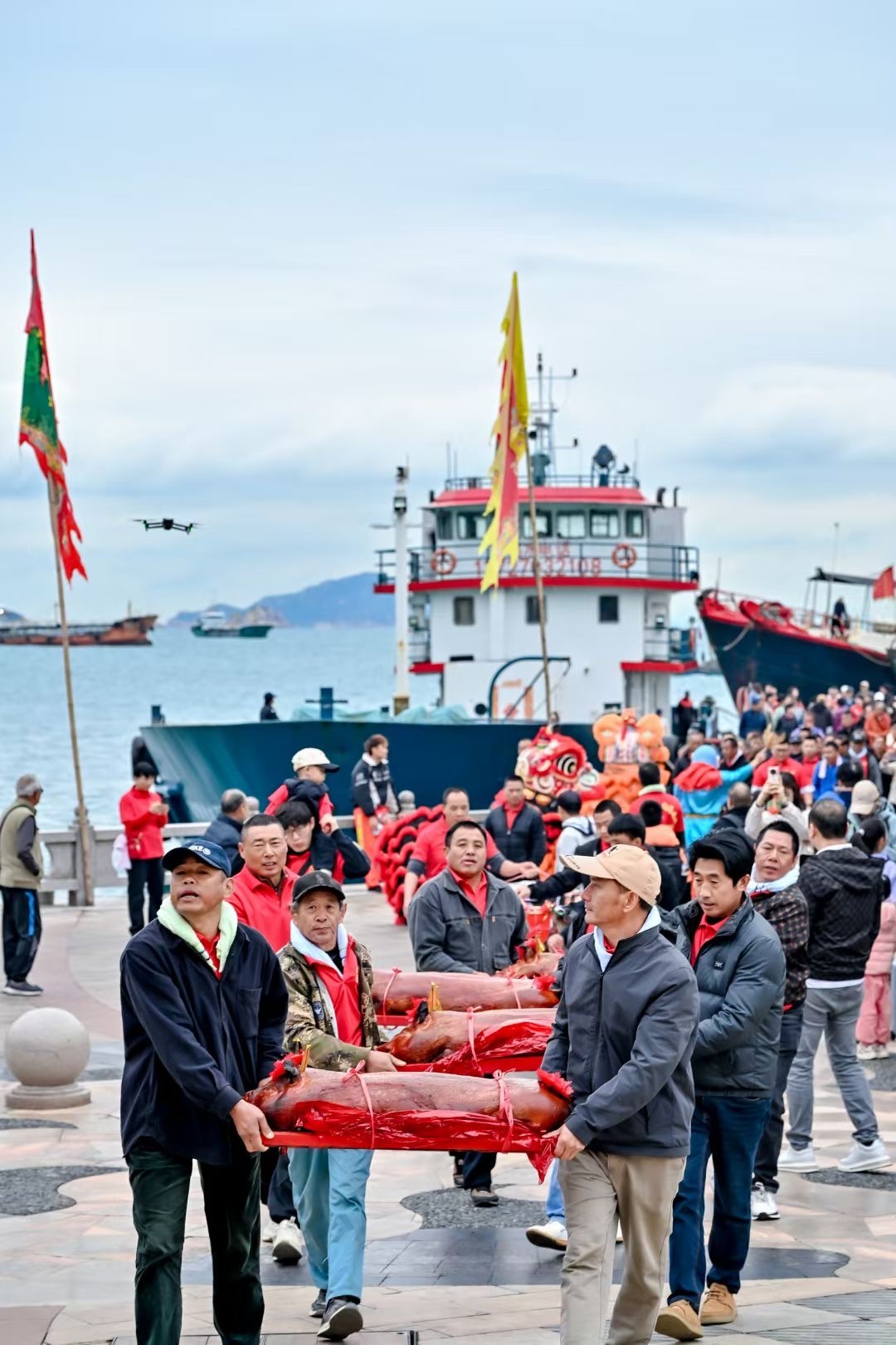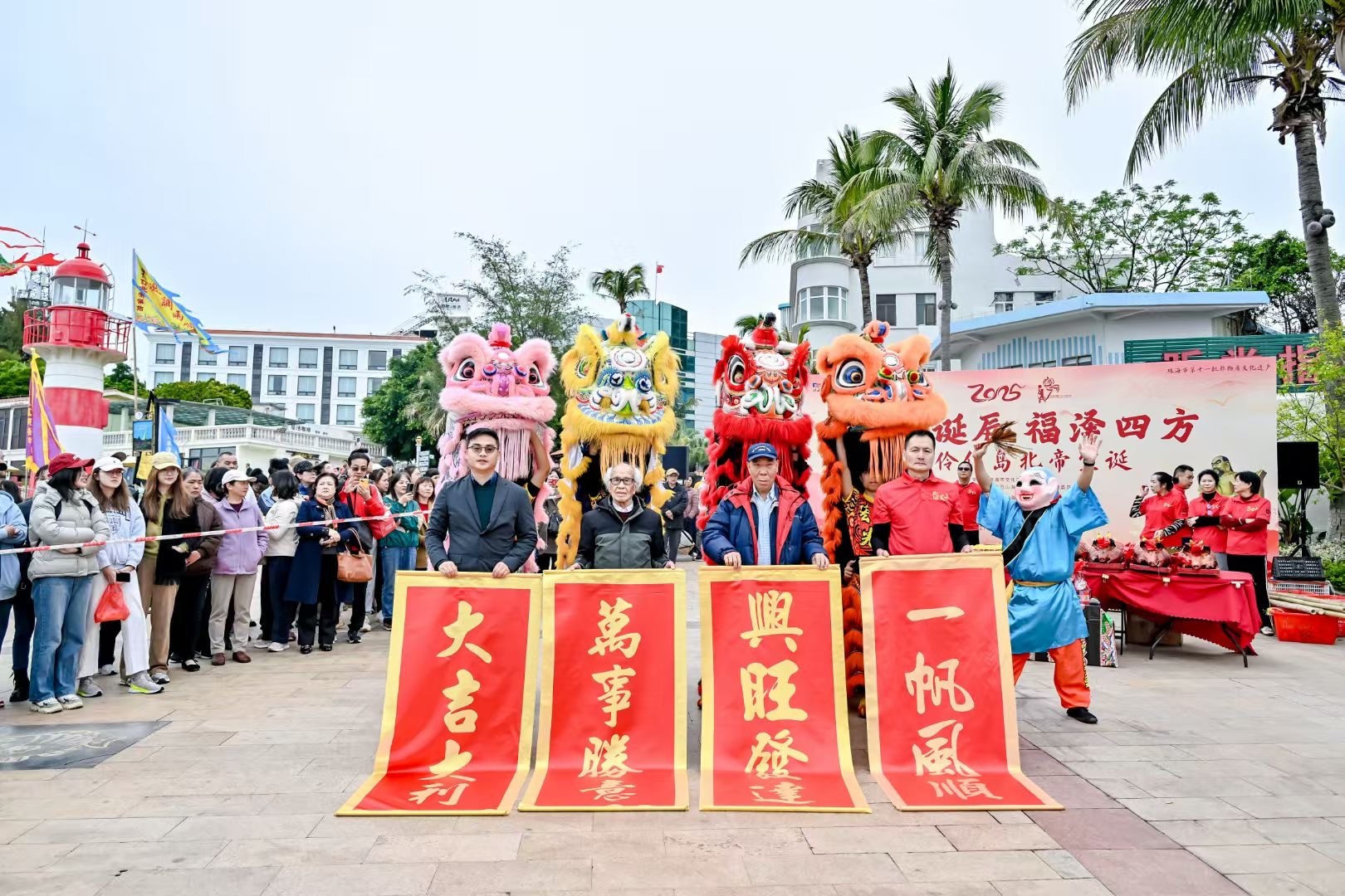 当天清晨,码头两侧的海边彩旗飘扬,上午10时左右,北帝诞庆典正式拉开帷幕。醒狮表演活力开场,在艺人的舞动下,醒狮活灵活现,赢得观众阵阵喝彩。随后,参加庆典的嘉宾为醒狮点睛,寓意开启新一年的好运吉祥。伶仃峰半山上,北帝庙钟声响起,“祭天”仪式开启。身着红衣的北帝诞理事会成员们抬着烧猪、鲜花、水果、海鲜等贡品,祈愿“海晏业丰”。海岛居民、港澳流动渔民及游客有序进入庙内祈福,将写满心愿的祈福带挂在许愿树上,表达对未来生活的美好祝愿。