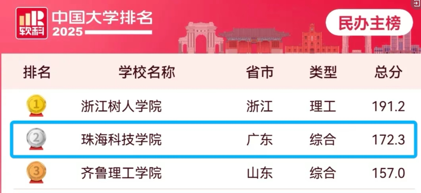 4月15日,软科发布“2025软科中国大学排名”。珠海科技学院以172.3分的成绩位列中国民办高校排名(主榜)全国第二。至此,该校连续四年位居该榜单民办大学全国第二。