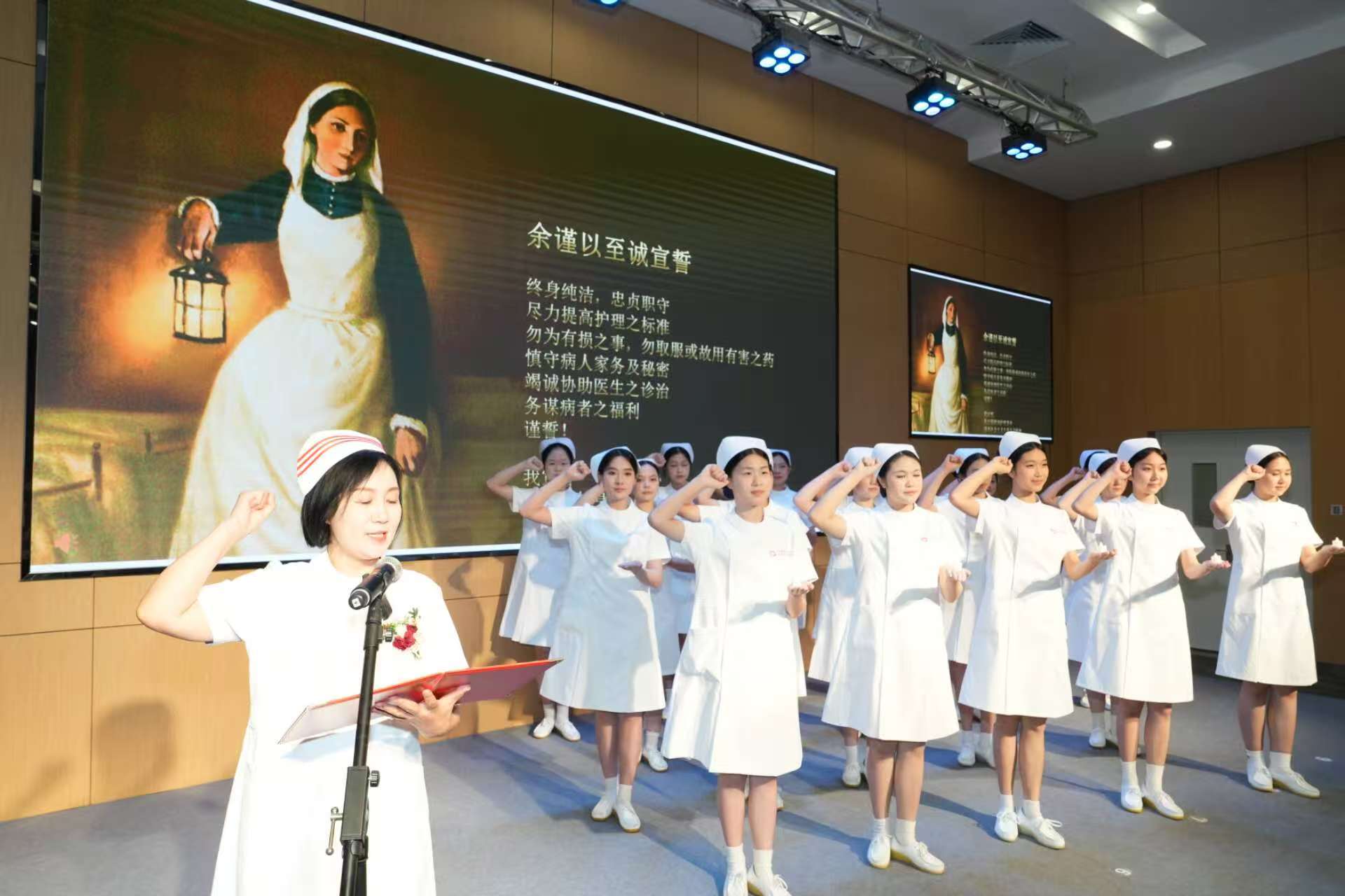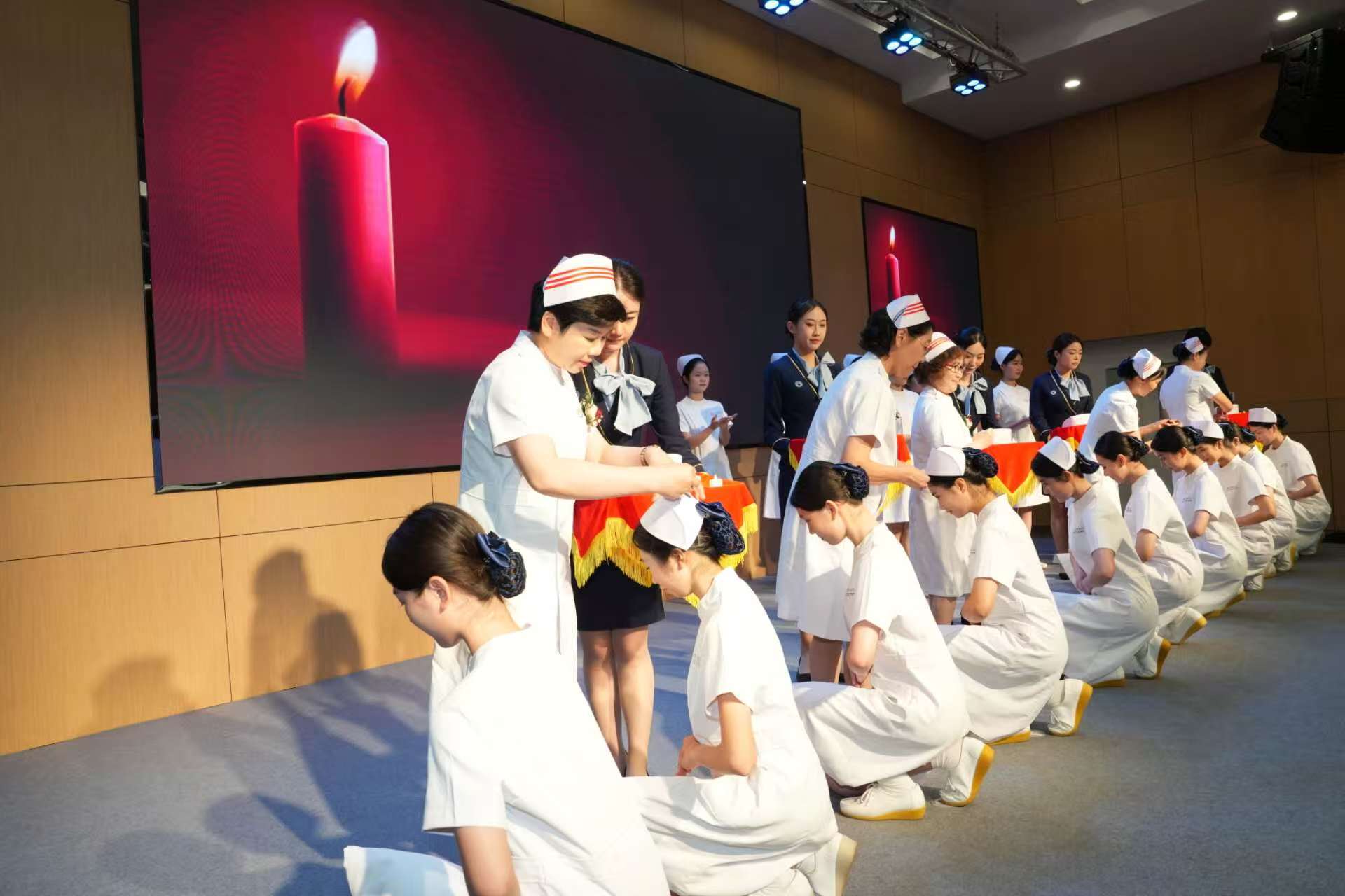 紧接着,在庄严的旋律中,珠海市护理学会荣誉会长冯建华和肖秀英、理事长叶俏及市护士协会荣誉会长于翠香、会长向亚利为珠海市卫生学校的20名护生代表们举行授帽仪式。象征南丁格尔精神的烛光轻轻跳动,映衬着洁白的燕尾帽,标志着“燃烧自己,照亮别人”的奉献精神将传递到新一批护生手上,也标志着一群朝气蓬勃的护生将踏上护理事业的新征程。