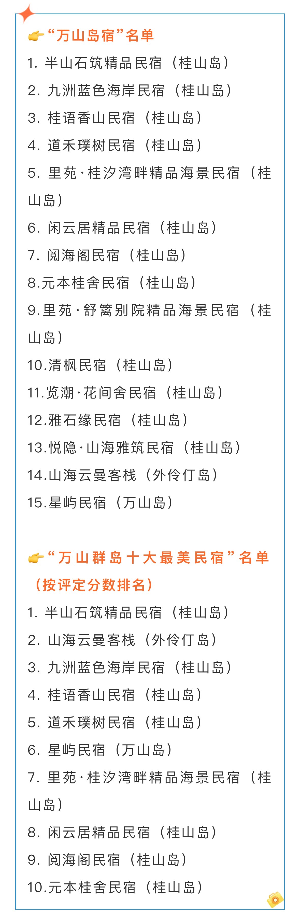 据了解,本次评定以《旅游民宿基本要求与等级划分》国家标准为指导,结合海岛地域特色,量身定制 “万山岛宿” 评分体系,从经营合规性、服务专业化水平、文化特色融合度等维度,对参评民宿进行全方位评估。本次获评“万山岛宿”的民宿将获得2万元的一次性奖励,而“万山群岛十大最美民宿”则额外获得2万元扶持资金。