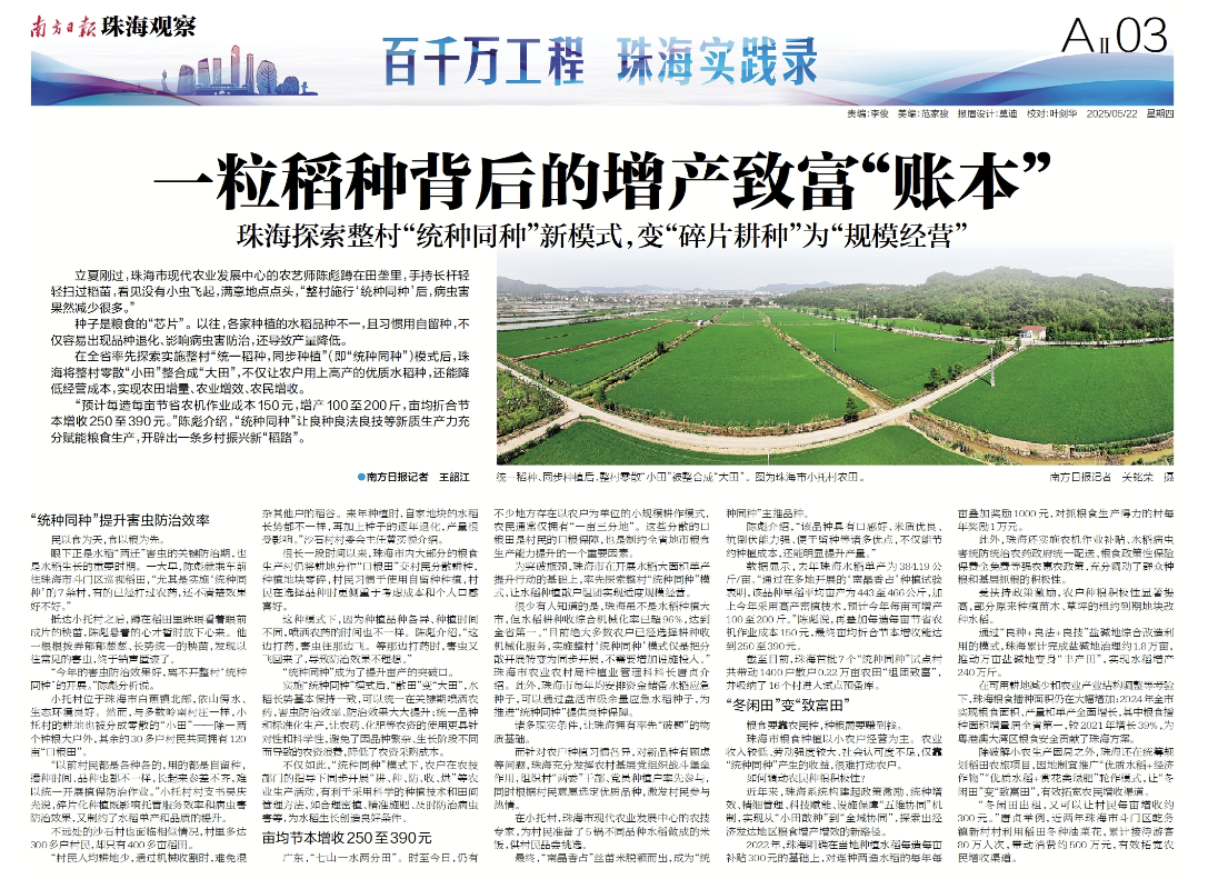 在全省率先探索实施整村“统一稻种,同步种植”(即“统种同种”)模式后,珠海将整村零散“小田”整合成“大田”,不仅让农户用上高产的优质水稻种,还能降低经营成本,实现农田增量、农业增效、农民增收。