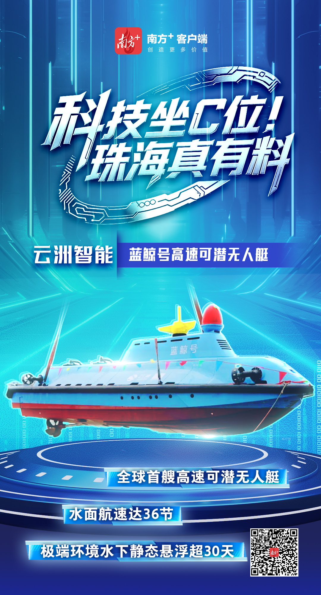珠海云洲智能科技股份有限公司自主研发的蓝鲸号高速可潜无人艇,是全球首款具备台风中心探测能力的高速可潜无人艇,水面航速达36节,创新性地实现了水面高速航行与水下潜航的双模式智能切换。该艇可在台风来临前快速下潜规避风浪,并通过搭载的探空火箭和精密探测设备,实时获取台风眼区关键气象数据。同时具备水下静态悬浮30天以上的能力,能用于气象探测、水下地形地貌测绘等领域,还可执行水下拍摄、水下水质取样、水下电缆管线巡检等多项任务。