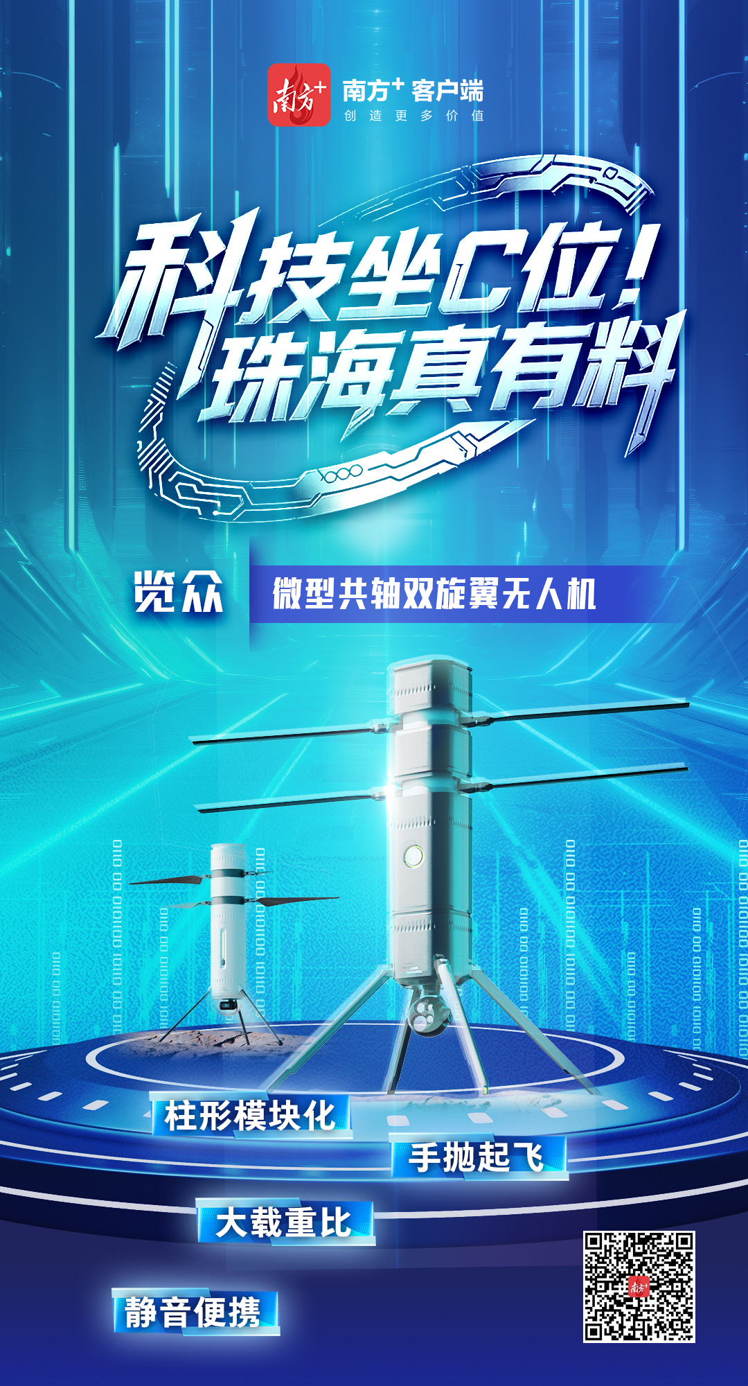 珠海览众创新科技有限公司的微型共轴双旋翼无人机,使用动力直驱+变距技术+共轴反桨设计,同时具备多旋翼与直升机的优势,机身纵向垂直重心布局,柱形模块化结构紧凑,易便携、运输、起降、发射;直升机先天的优势也完整地保留,高速、抗风、大载重比、高海拔适应性。在整机构型、控制方式、整体性能、应用方式等均取得实质性技术突破,完成产品化验证,技术产品实现了国内首创。