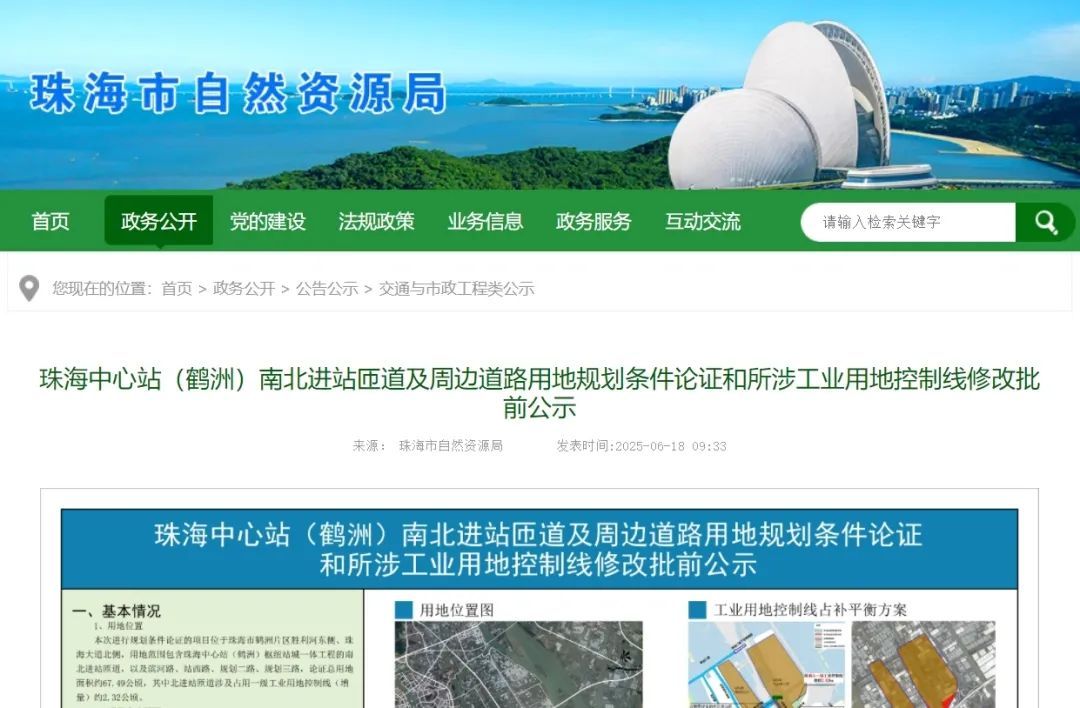 近日,珠海市自然资源局发布《珠海中心站(鹤洲)南北进站匝道及周边道路用地规划条件论证和所涉工业用地控制线修改批前公示》(以下简称《公示》)。