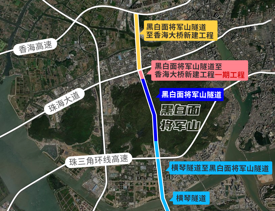 黑白面将军山隧道至香海大桥新建工程二期项目是横琴粤澳深度合作区对外联通的核心通道,也是畅通香洲区南屏、前山等片区交通网络的重要通道,已列入广东省及珠海市双层级重点项目,其南接珠海大道全互通立交,北联香海大桥格力城收费站,主线全长2.451公里,按双向六车道城市快速路标准建设,设计速度60公里/小时。