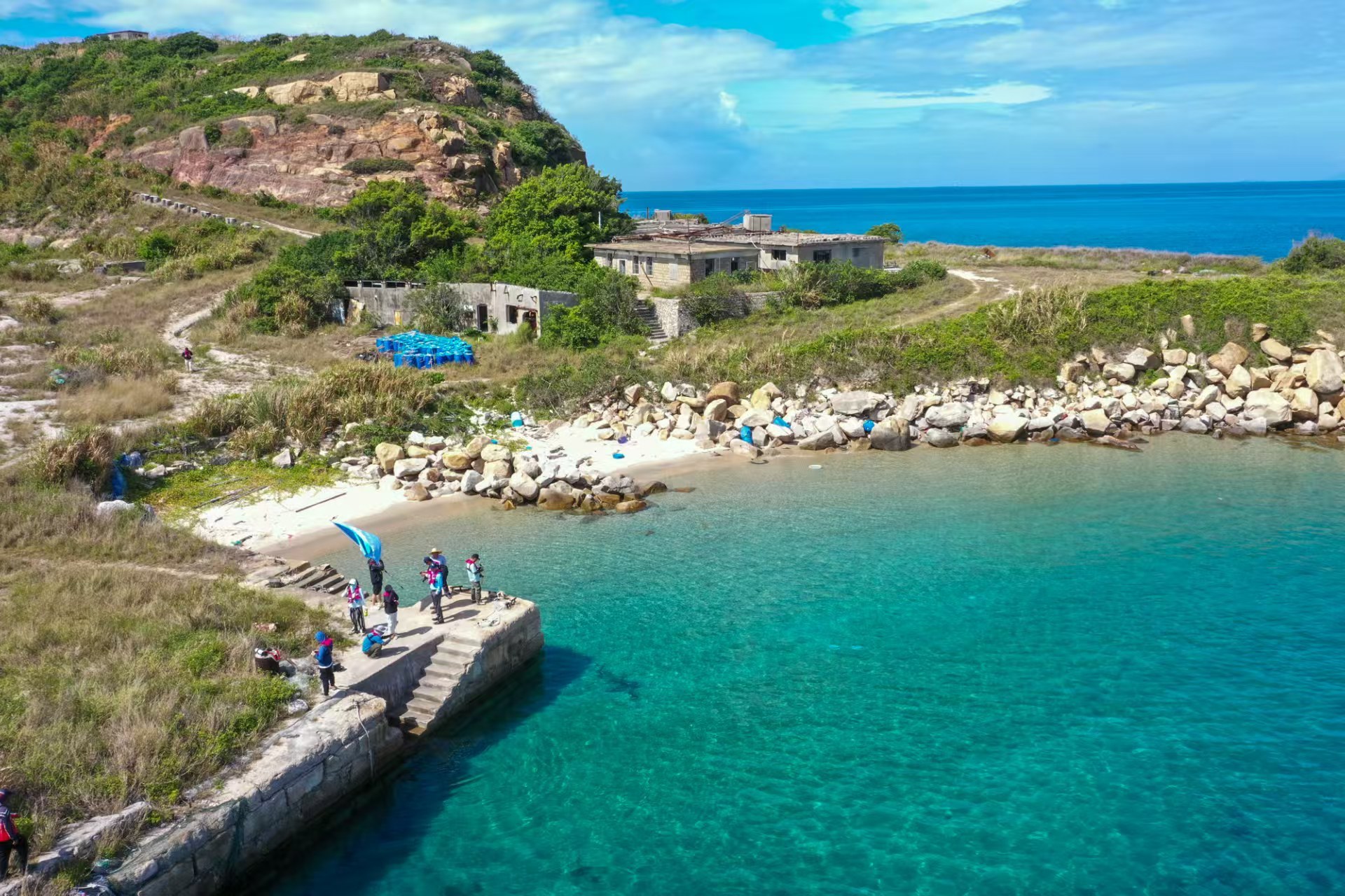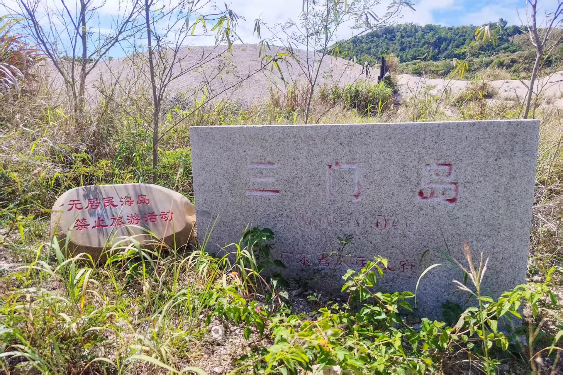 船抵三门湾,习习海风拂过耳畔。下船,走过一段细软的白沙滩,就能轻易登岛,刻着“无居民海岛禁止旅游活动”的石碑立在码头不远处。这里不对公众开放,平时鲜有人来,封存着一段鲜为人知的“三门往事”。