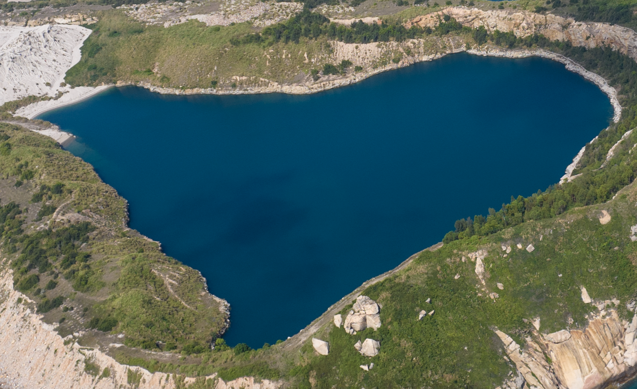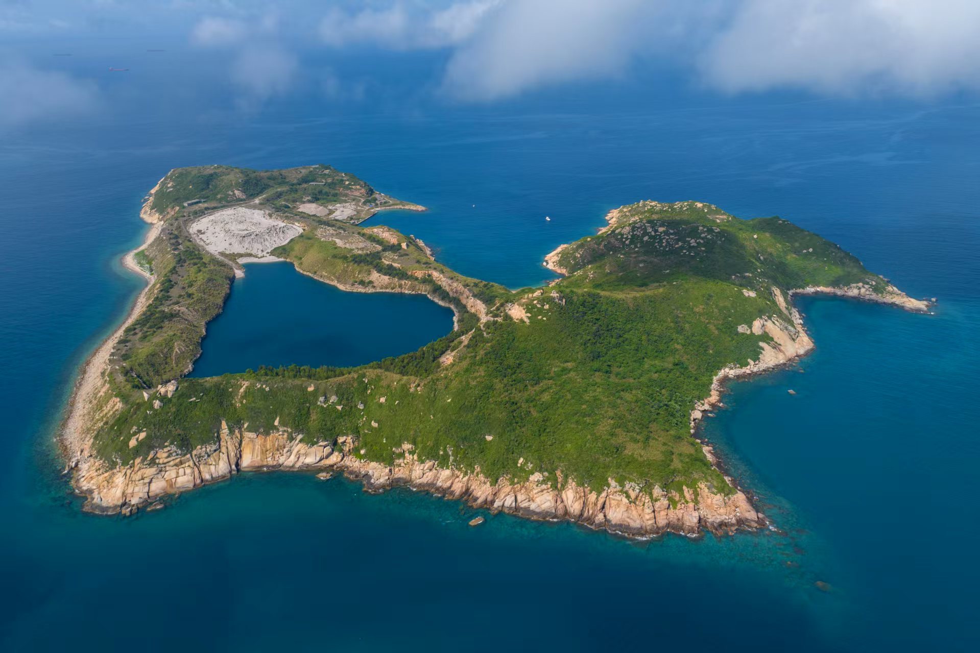 这里与香港一水相连,近在咫尺。1981年,珠海市与香港合资在三门岛开办采石场,开山挖石,供应香港机场建设。随着采石活动的终止,昔日采石留下巨大的露天矿坑,丰沛的雨水逐渐充盈其中,化作碧波荡漾的“矿坑湖”。