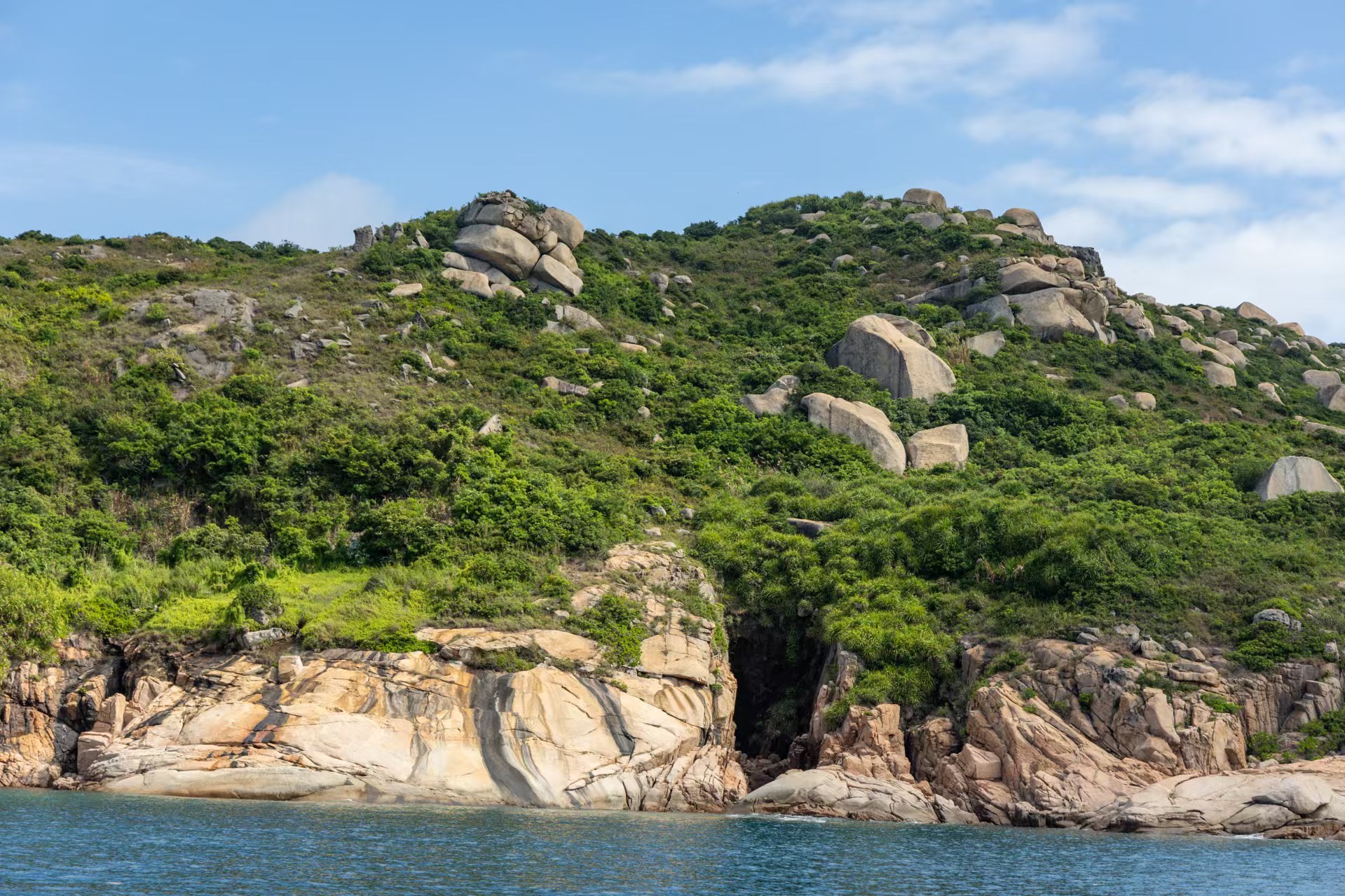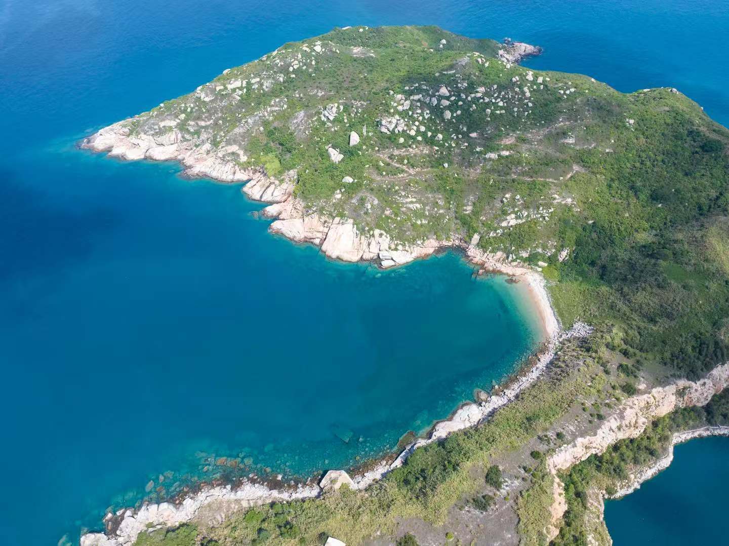 三门岛面积不过0.86平方公里,从高空俯瞰形如飞鸟。岛的边缘,是花岗岩切出的细密笔直的线条,经过风化,有了切片般的纹理。岛面覆盖的丰厚的绿色植被,好像一层要融化溢出的抹茶奶油。