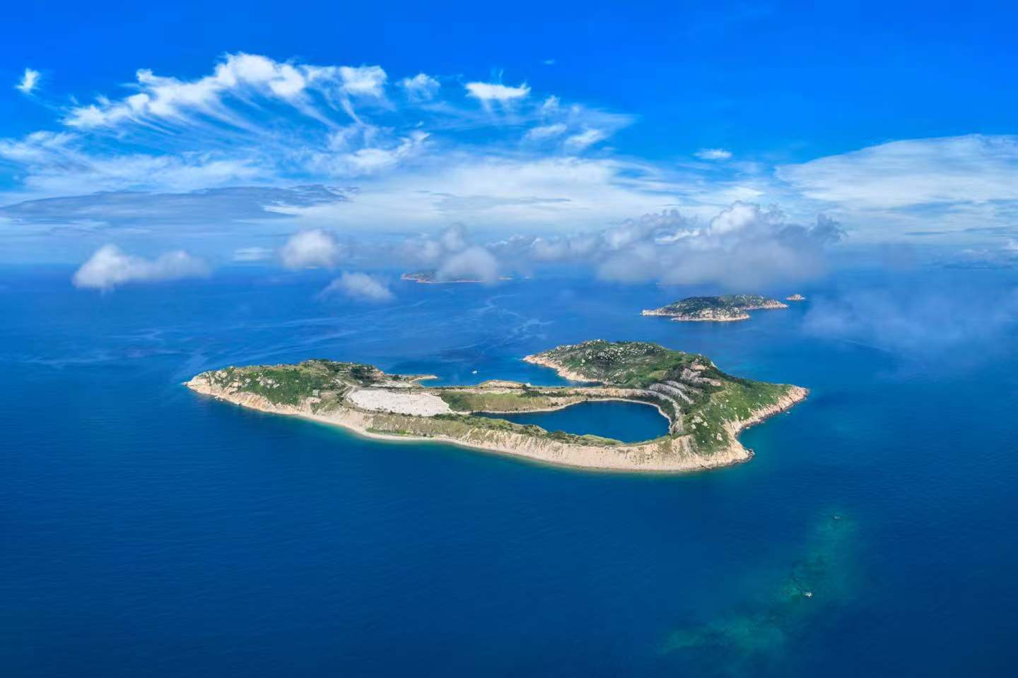 三门湾水深最深处达30米,是万山群岛最优良的港湾之一。岛中有湖,湖似“心形”,莹润碧透,如一颗翡翠镶嵌在三门列岛的怀抱之中,成一大景观。