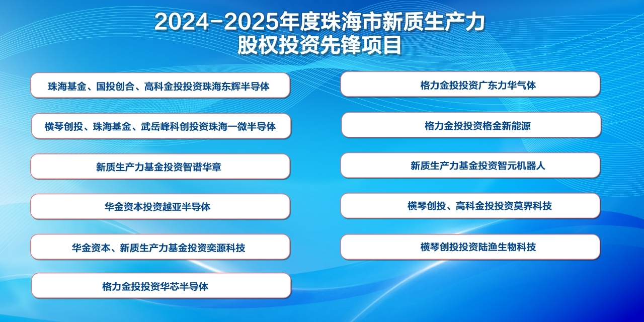 珠海科技集团旗下珠海基金、新质生产力基金、华金资本、格力金投、横琴创投均有项目上榜,投资企业包括东辉半导体、珠海一微半导体、智谱华章、越亚半导体、奕源科技、华芯半导体、广东力华气体、格金新能源、智元机器人、莫界科技以及陆渔生物科技。