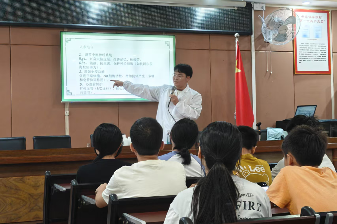 在草蓢村文化活动中心,突击队员以常见的感冒为切入点,向青少年普及安全用药知识,并引导他们感受传统中医药文化的独特魅力。同时,他们还带来了实用的厨房化学知识,通过生动讲解和趣味实验,既提升了大家的安全意识,也在日常生活场景中架起了理解化学的桥梁,让知识在“烟火气”中扎根生长。