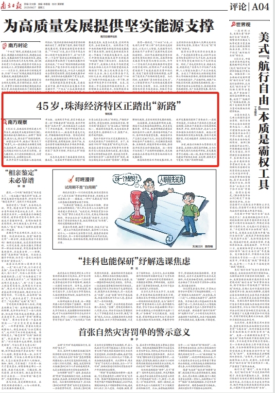 珠海经济特区45年的发展历程,为城市发展路径提供了重要启示:一座城市的高度,不仅取决于其经济总量或建设规模,还取决于其能否以系统思维统筹改革、开放、创新与保护,走出人与自然和谐共生的现代化路径。珠海以有限陆域面积实现全面发展,靠的不是规模扩张,而是功能提升、结构优化与内涵增值。