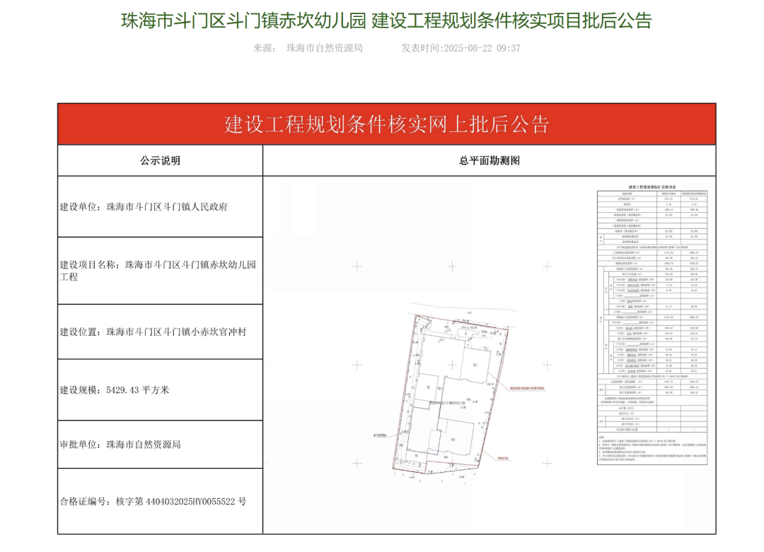 近日,珠海市自然资源局发布《斗门镇赤坎幼儿园建设工程规划条件核实项目批后公告》。标志着斗门镇赤坎幼儿园离投入使用又近了一步。