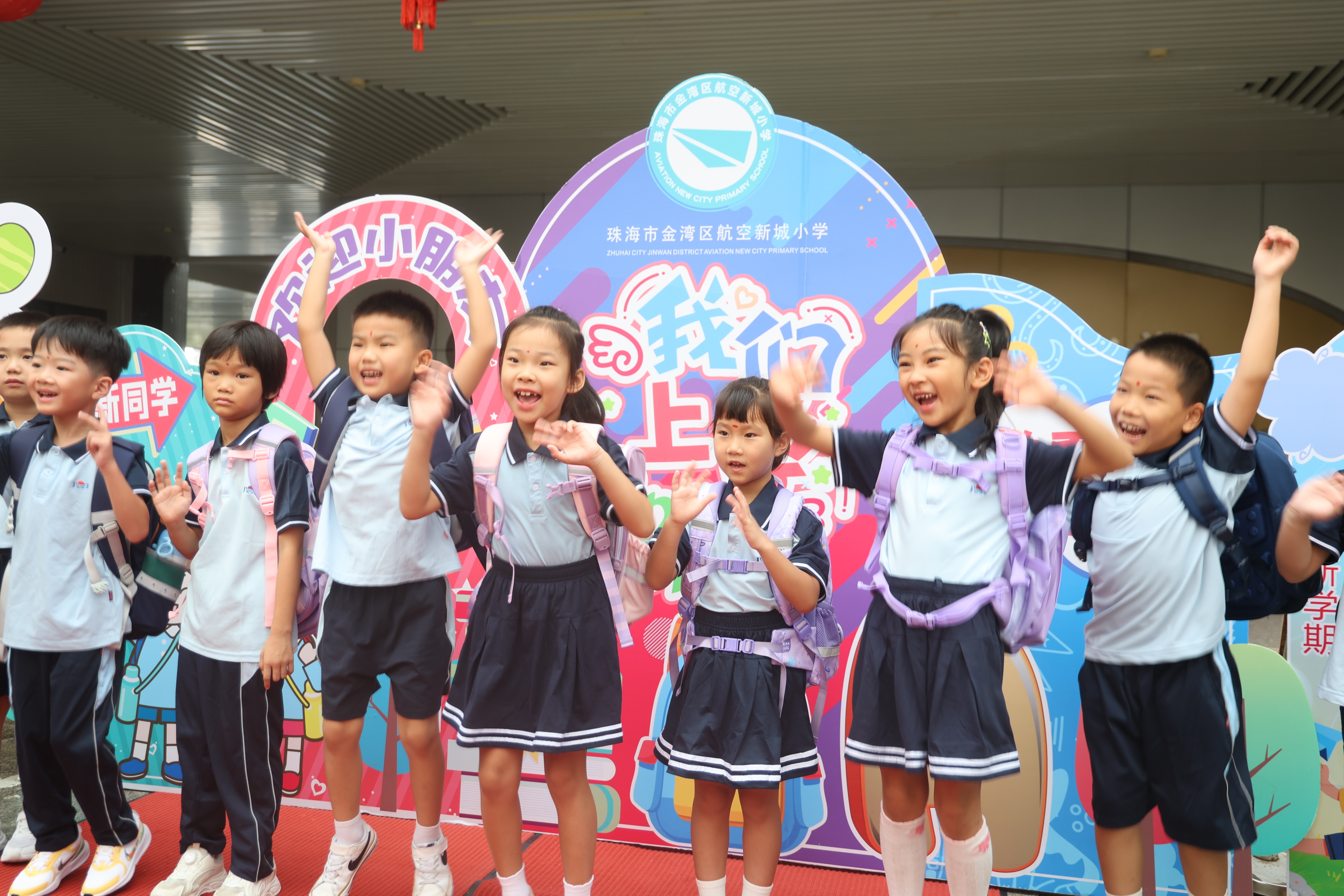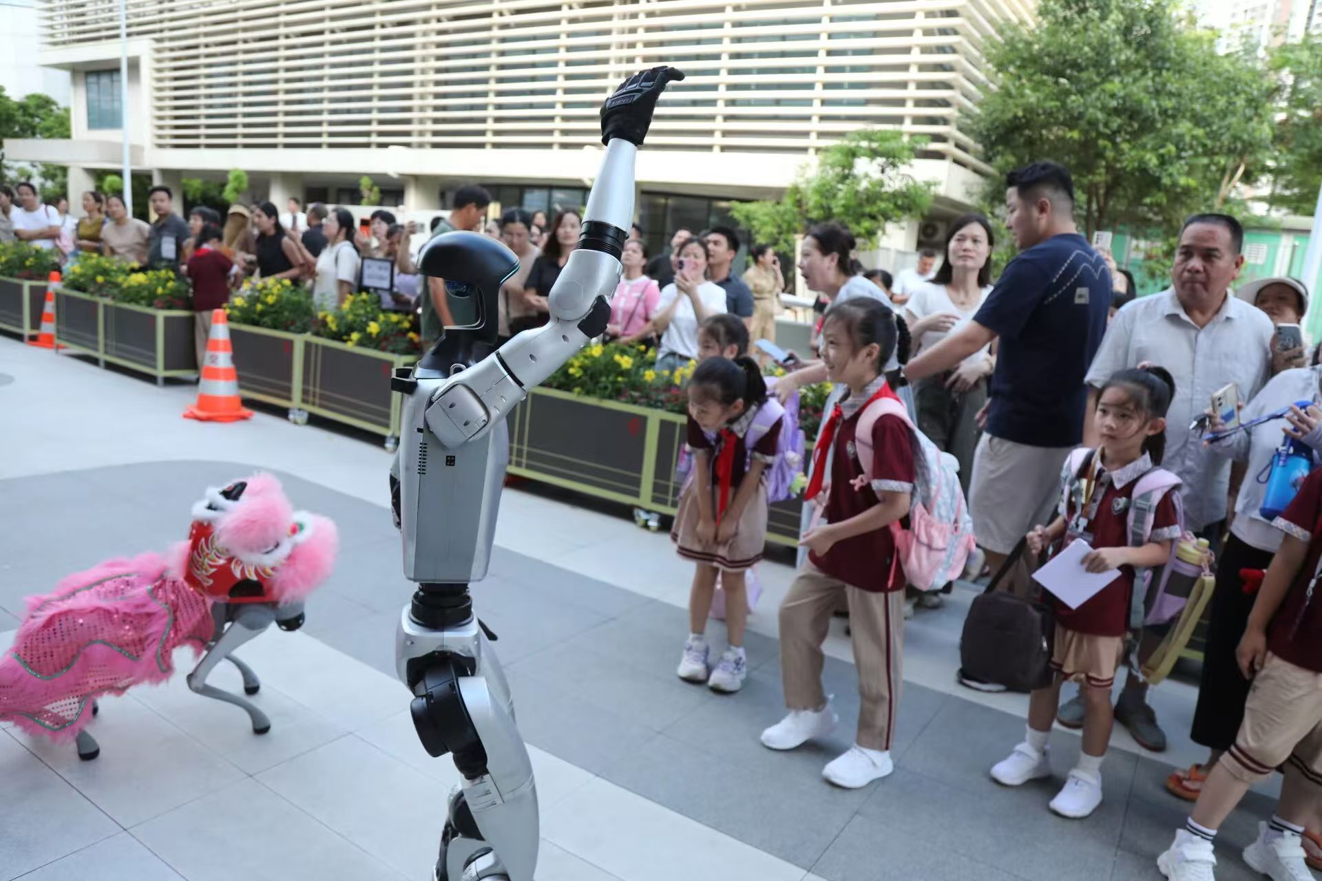 “开学搬新家啦!”今年开学季,珠海市香洲区暨珠小学6个年级24个班1127名师生告别鸿鹄幼儿园,搬入位于暨大珠海校区南侧的新校园。9月1日开学当天,一台机器人与一只机器狗与学校行政人员一起列队欢迎大小朋友。机器手臂不时高抬,向同学们挥手致意,超萌动作引来同学们关注。