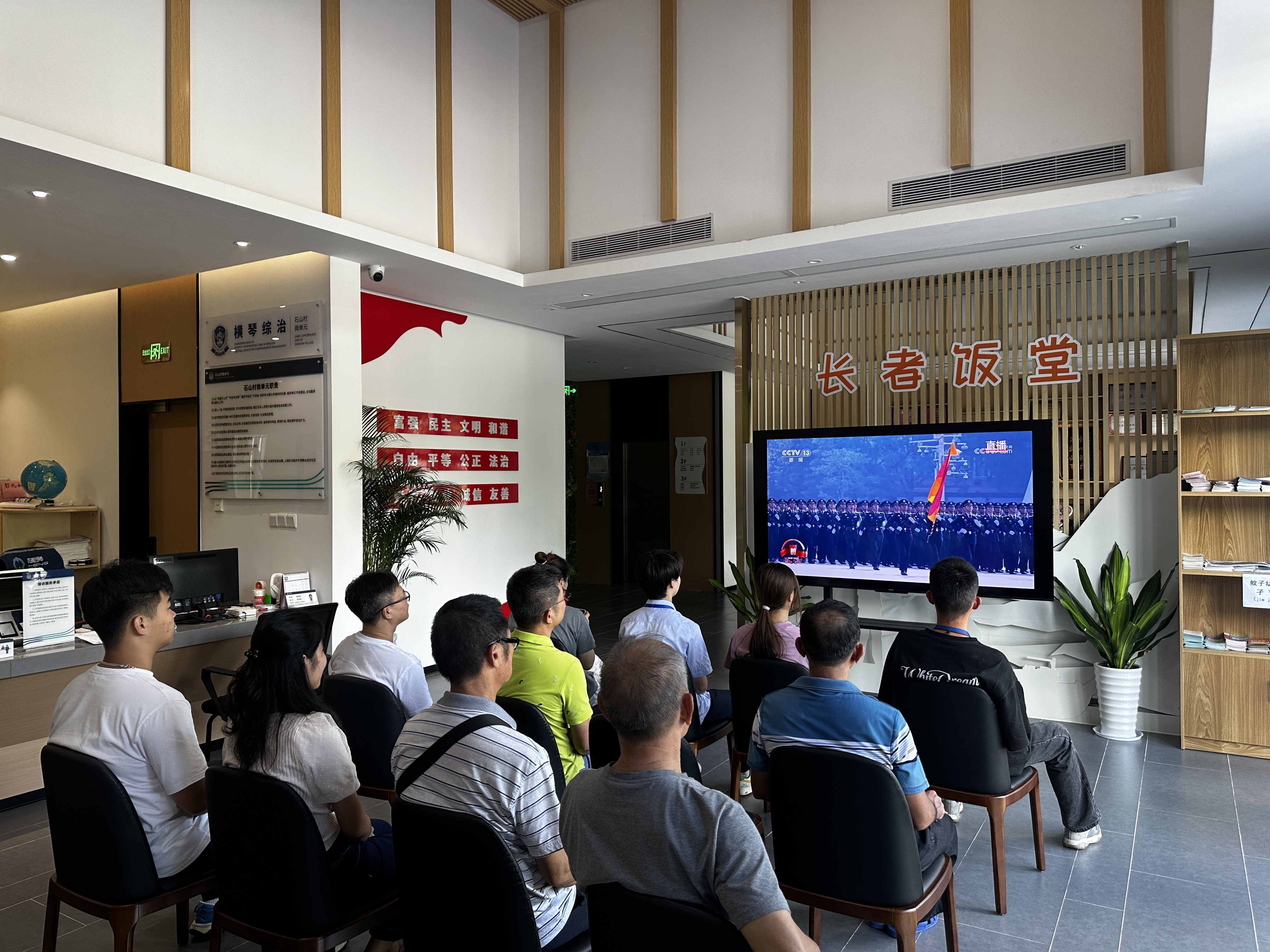 在合作区新时代文明实践站,各社区与爱国爱澳社团共同组织琴澳居民观看阅兵直播。