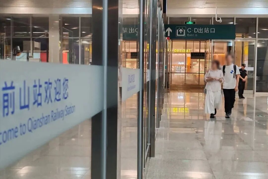 在前山站购票候车大厅,安检通道外侧加装了一道2米多高的不锈钢玻璃围栏,隔离出了一道可供行人24小时通行的过街通道。为保障路人夜间过街安全,围栏顶端还布设了防攀爬感应报警装置,通道内有安保人员进行值守。