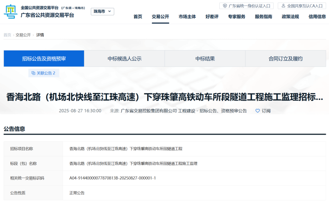 近日,广东省交易控股集团有限公司发布《香海北路(机场北快线至江珠高速)下穿珠肇高铁动车所段隧道工程施工监理招标公告》(以下简称《公告》)。本次工程实施土建部分,即隧道暗埋段+敞开段全部主体结构。