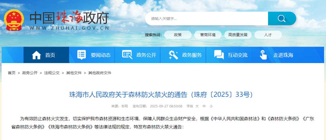 为有效防止森林火灾发生,切实保护我市森林资源和生态环境,保障人民群众生命财产安全,根据《中华人民共和国森林法》和《森林防火条例》《广东省森林防火条例》《珠海市森林防火条例》等法律法规的规定,特发布森林防火禁火通告:
