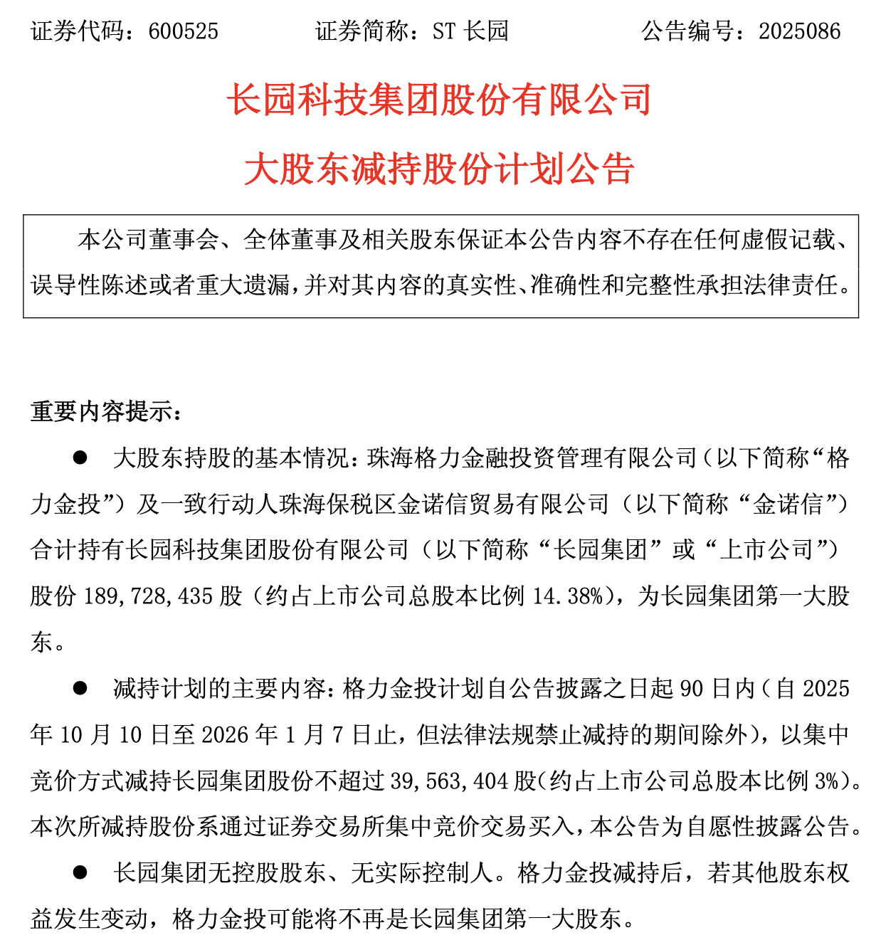 10月9日晚,长园集团(“ST长园”,股票代码:600525)发布公告:第一大股东格力金投基于对投资风险的审慎管理,计划自公告披露之日起90日内,以集中竞价方式减持长园集团股份不超过39,563,404股(约占上市公司总股本比例3%)。减持后,若其他股东权益发生变动,格力金投可能将不再是长园集团第一大股东。