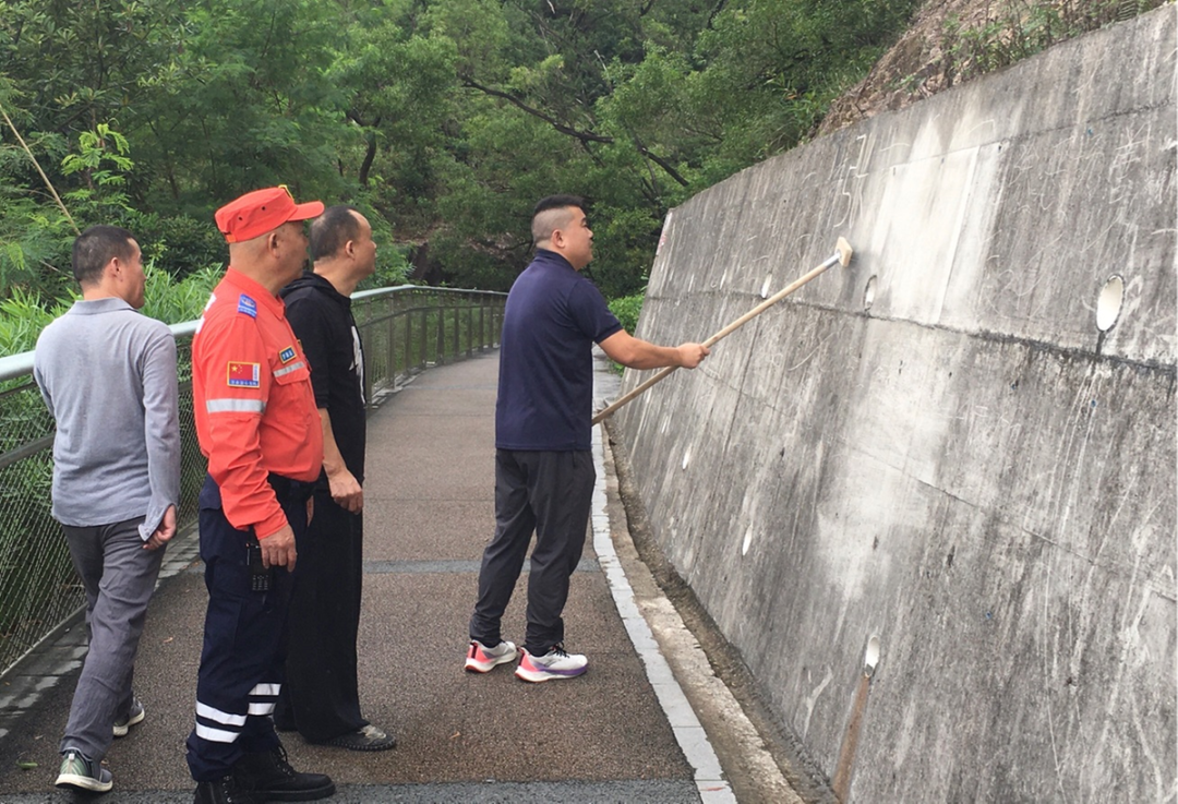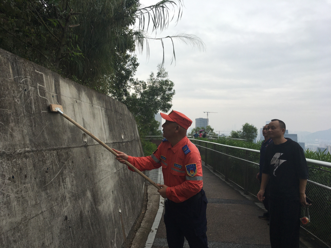 10月29日上午,上述栈道设施管理企业工作人员,联合珠海应急救援万众益心支队志愿者,对挡土墙所在区域进行集中清洁。