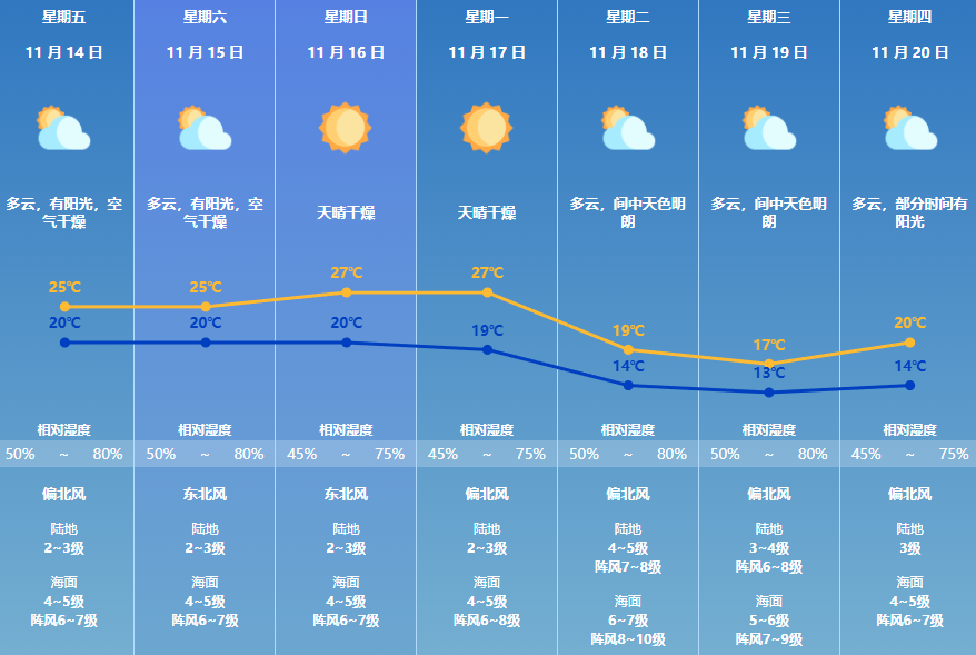 受加强的副热带高压控制影响,预计本周后期珠海市多云间晴,阳光增多,空气干燥,正是把厚衣服拿出来洗晒的好时机,因为新一轮的降温已经在路上!