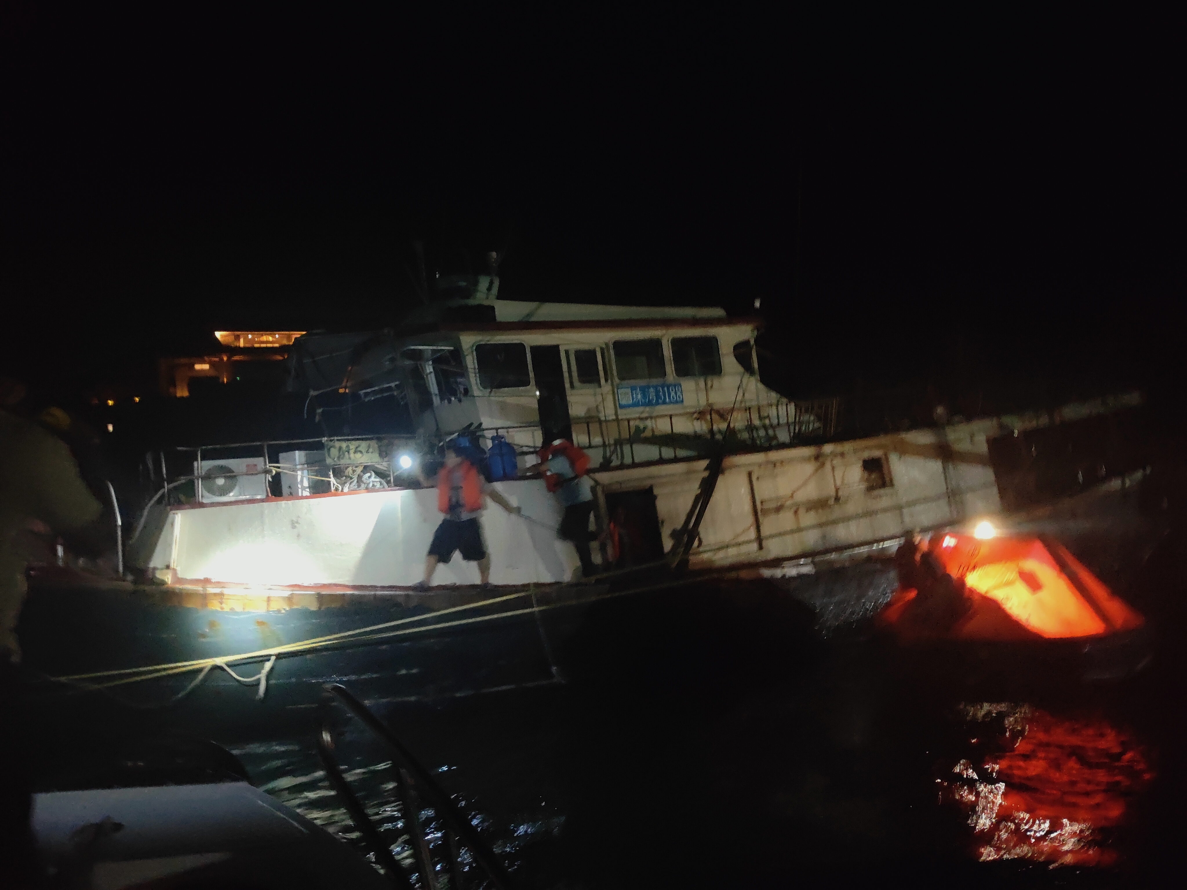 23时18分,救援船装载救援设备出海,途中救援人员持续与遇险船员保持电话沟通,一边安抚其紧张情绪,一边确认大致方位。