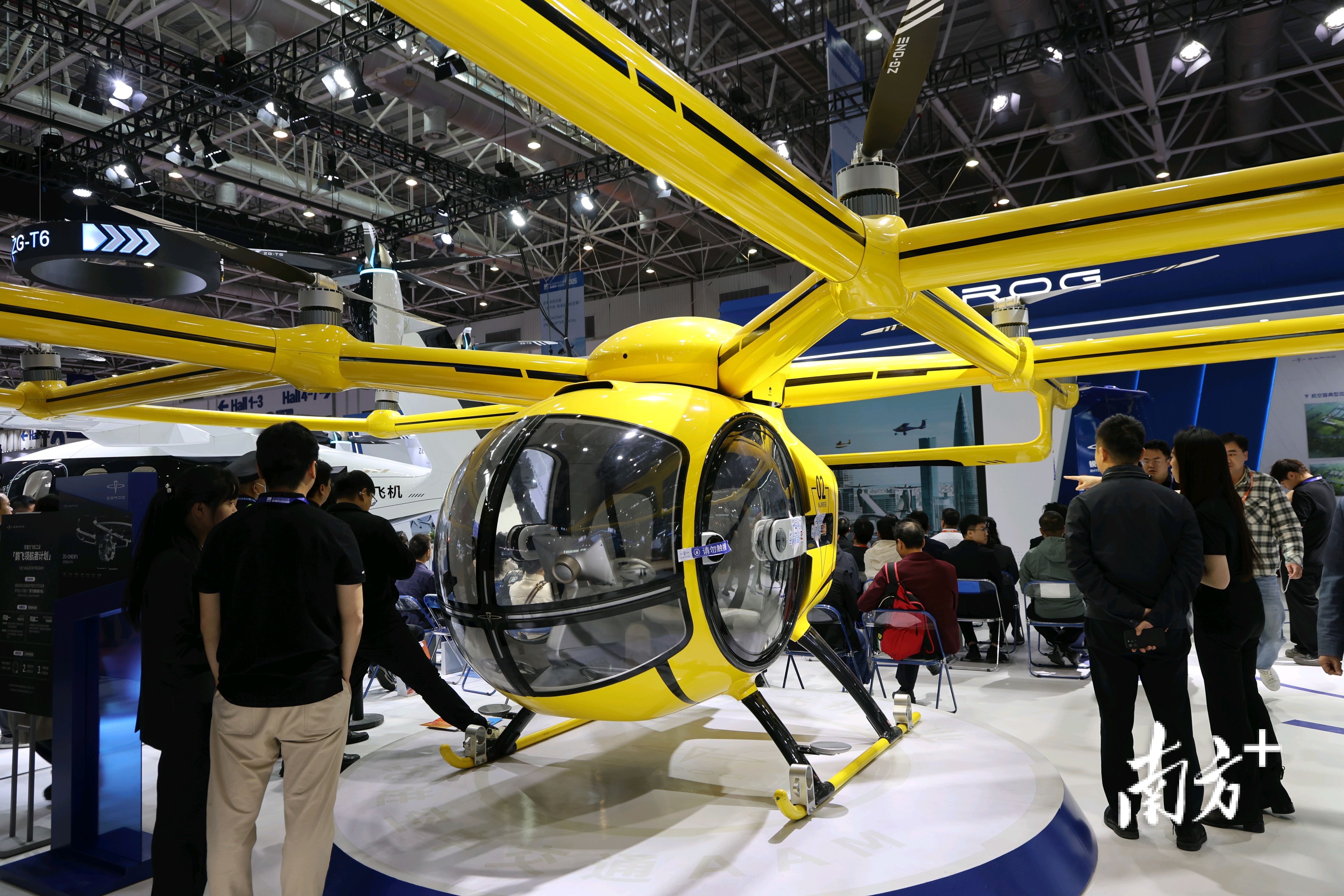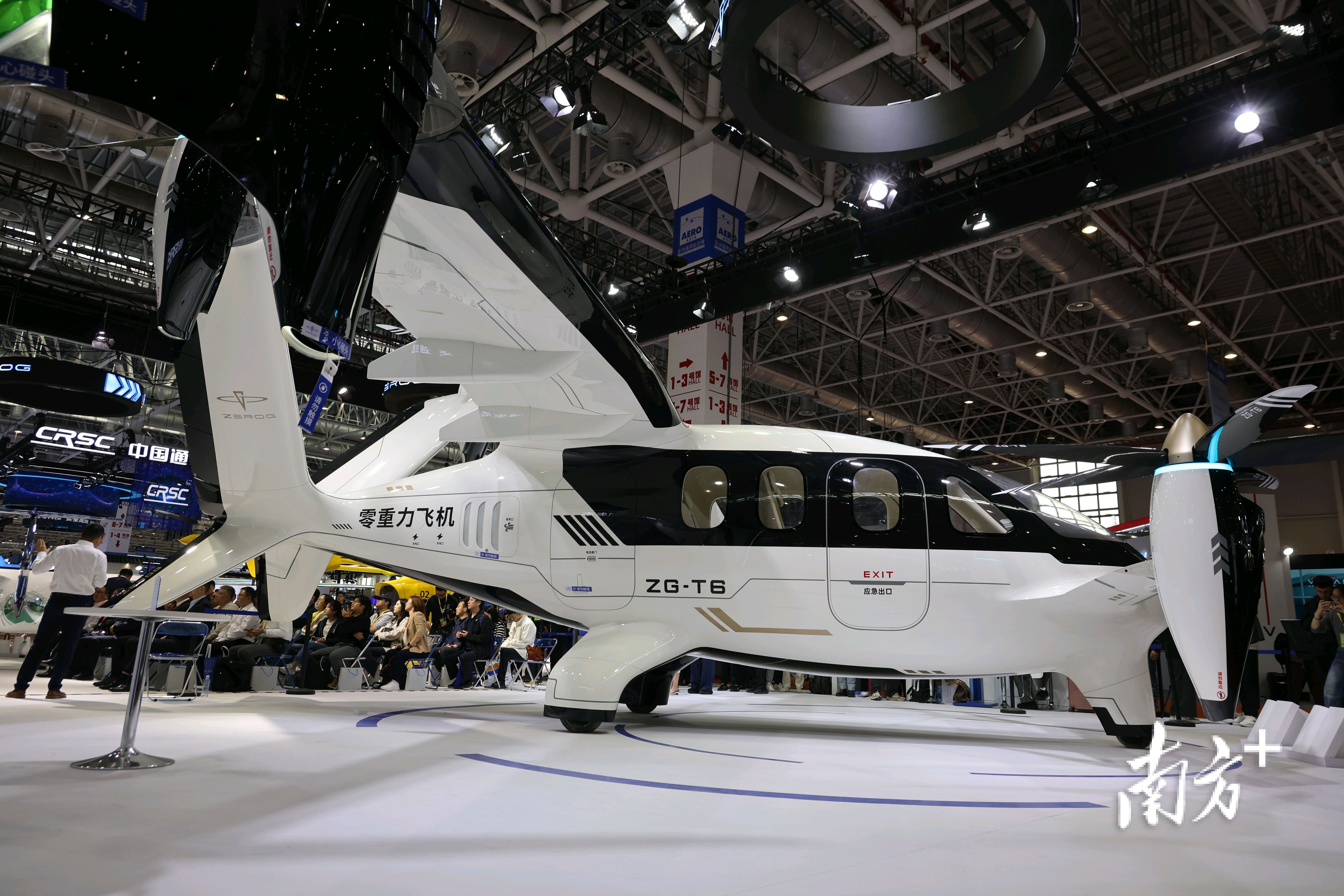 走进零重力飞机工业展位,首次公开展示的电动倾转旋翼飞行器ZG-T6成为最吸睛的产品之一。相对于场馆内展示的其他机型,ZG-T6有着更大的身躯,其载重量、续航能力等适用于城市、城际等中、短程交通运输等低空场景。