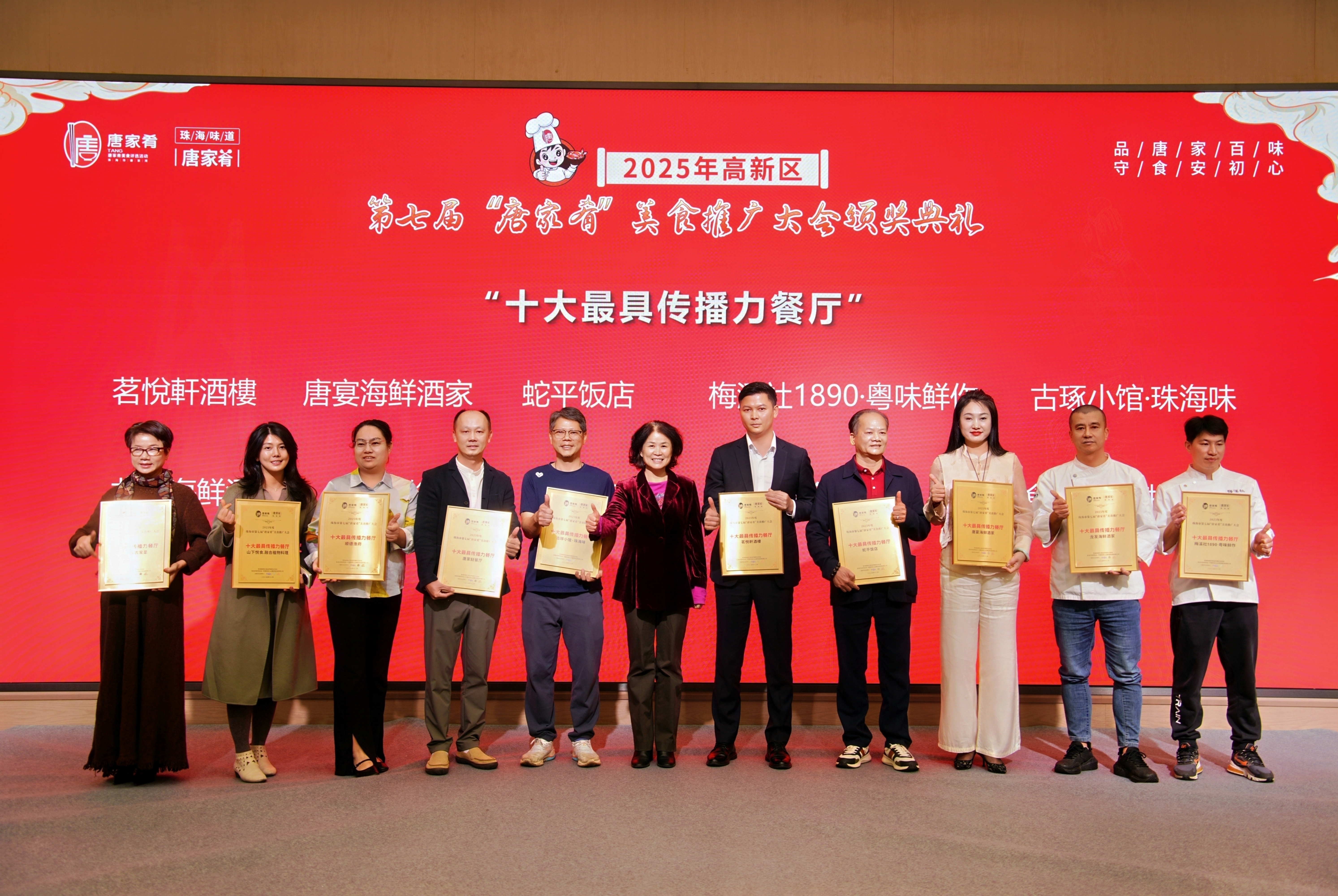 颁奖典礼现场全面回顾了本届活动的丰硕成果,并根据前期评审团评议表决,依次颁发了“新锐粤厨金奖”“人气粤厨金奖”,以及“唐家肴匠心守艺奖”“唐家肴新潮风味金奖”“唐家肴珠海味金奖”“唐家肴金勺奖”和“唐家肴十大最具传播力餐厅”等奖项,表彰在食品安全、厨艺创新及品牌传播方面表现突出的单位与个人。