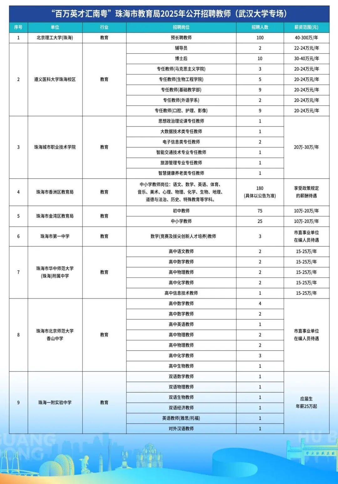 高等教育板块:由北京理工大学(珠海)、遵义医科大学珠海校区、珠海城市职业技术学院3家单位领衔,共提供147个岗位,面向硕士、博士等高学历人才。薪资待遇极具竞争力,如北京理工大学(珠海)的“预长聘教师”岗位,年薪范围在40万至300万元之间。