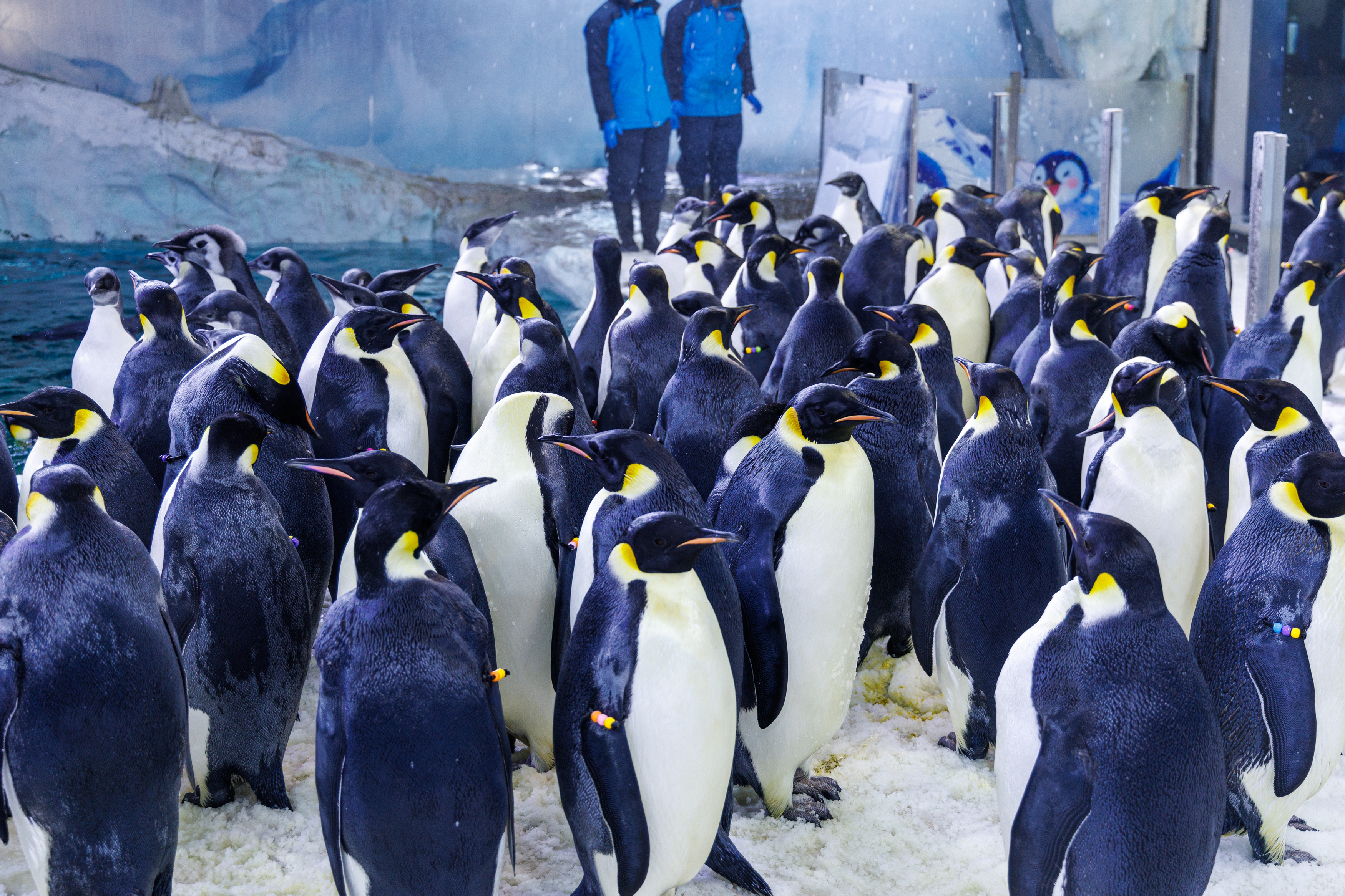 为确保帝企鹅宝宝们平稳过渡,长隆保育团队制定了一套科学的融合方案。在合群前,先让成年帝企鹅轮流进入“幼儿园”区域,让彼此熟悉气味与存在;同时耐心引导帝企鹅宝宝学习下水,初期严格控制游泳时间约30分钟,并专人看护,然后逐步延长时长,帮助它们熟练掌握上岸技巧。这种循序渐进的引入方式,有效减少了个体间的冲突,保障每只帝企鹅宝宝都能安心融入大家庭。