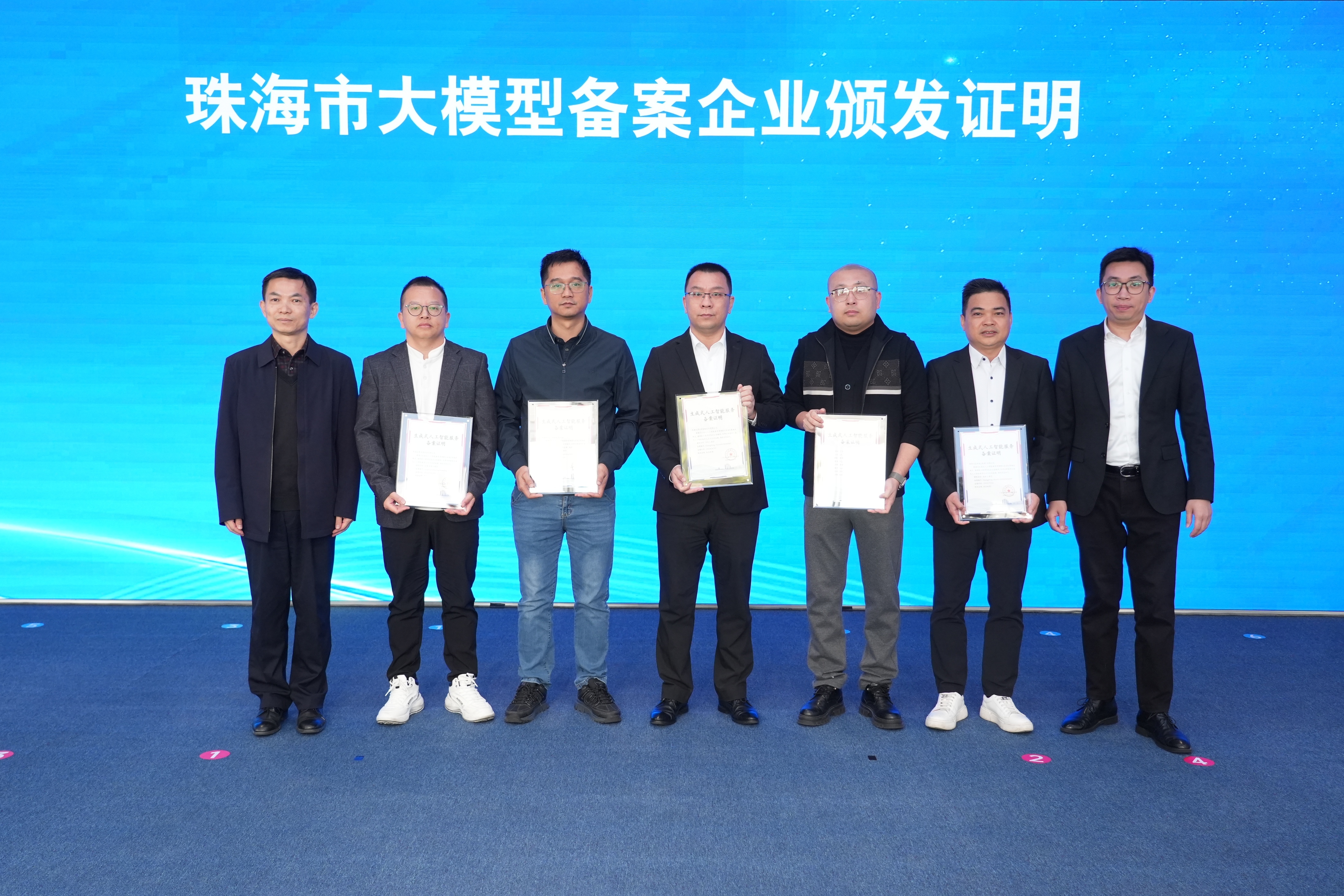 当天活动现场还为最新一批大模型备案企业颁发证书,7家企业获颁“生成式人工智能服务备案证明”。
