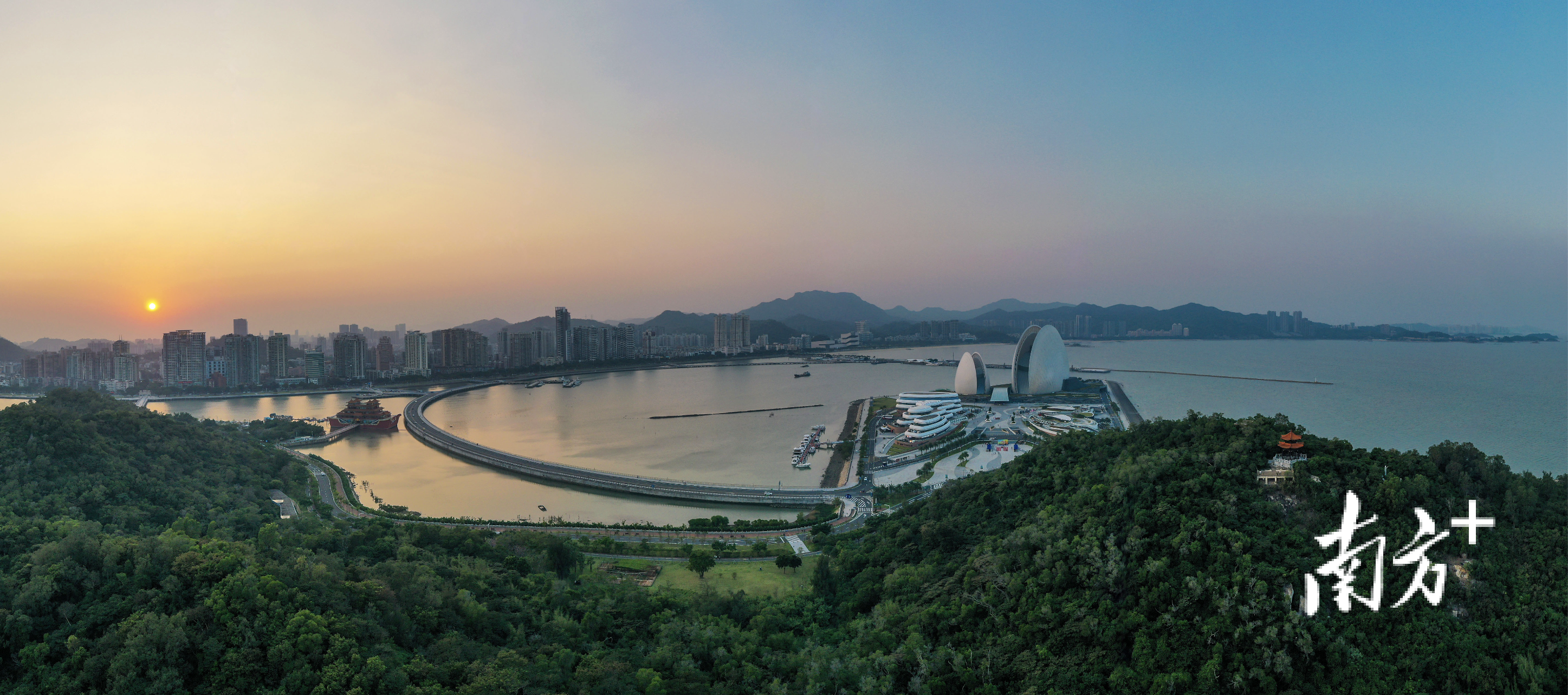 若沿环岛路骑行,两旁植物簇拥成廊。从这里望去,渔女手捧的明珠,与“日月贝”大剧院皎洁的轮廓,在碧海青天间交织成一幅传统与现代交融的美丽画卷。