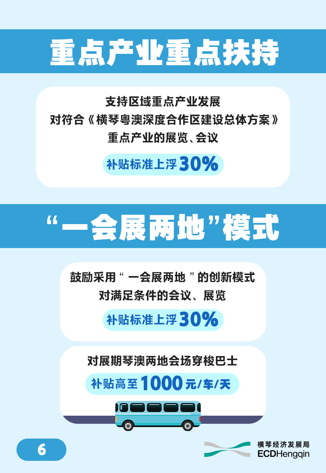 为降低企业办展成本,《扶持办法》还对“一会展两地”项目往来琴澳场地间的交通费用给予补贴。对参会参展代表葡语及西语国家代表占比超过10%的项目,也设有相应激励措施。