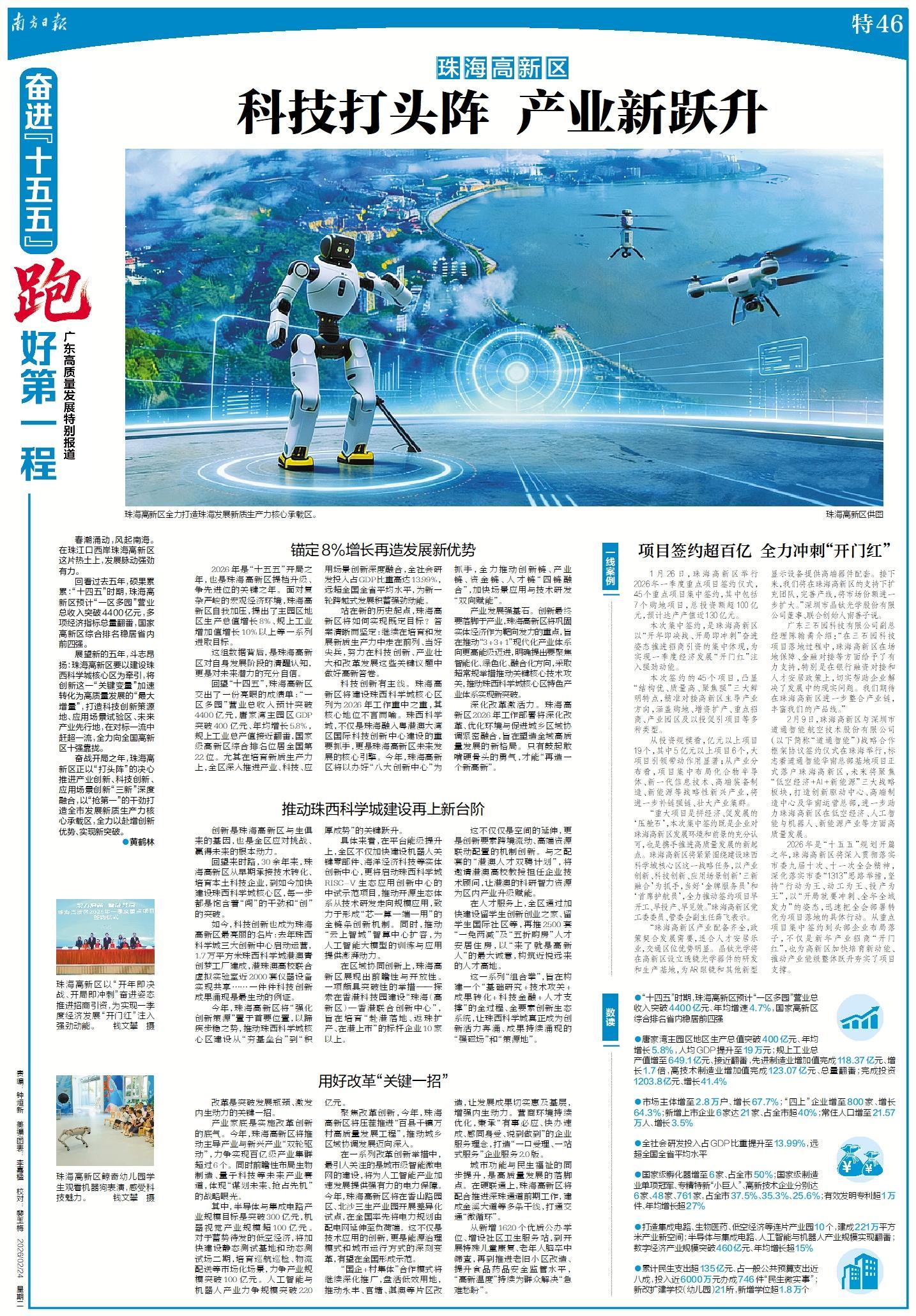 产业家底是实施改革创新的底气。今年,珠海高新区将推动主导产业与新兴产业“双轮驱动”,力争实现百亿级产业集群超过6个。同时前瞻性布局生物制造、量子科技等未来产业赛道,体现“谋划未来、抢占先机”的战略眼光。