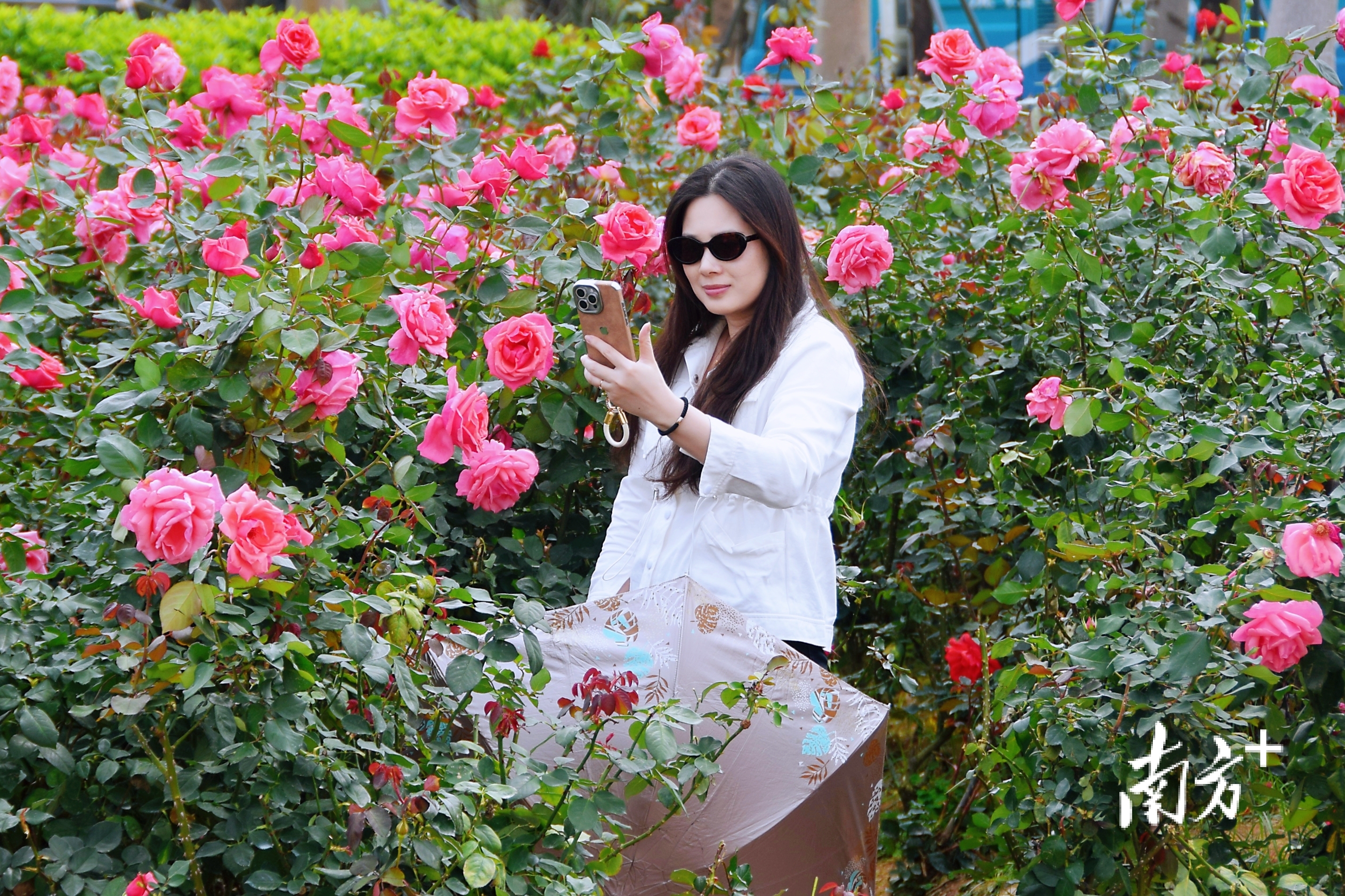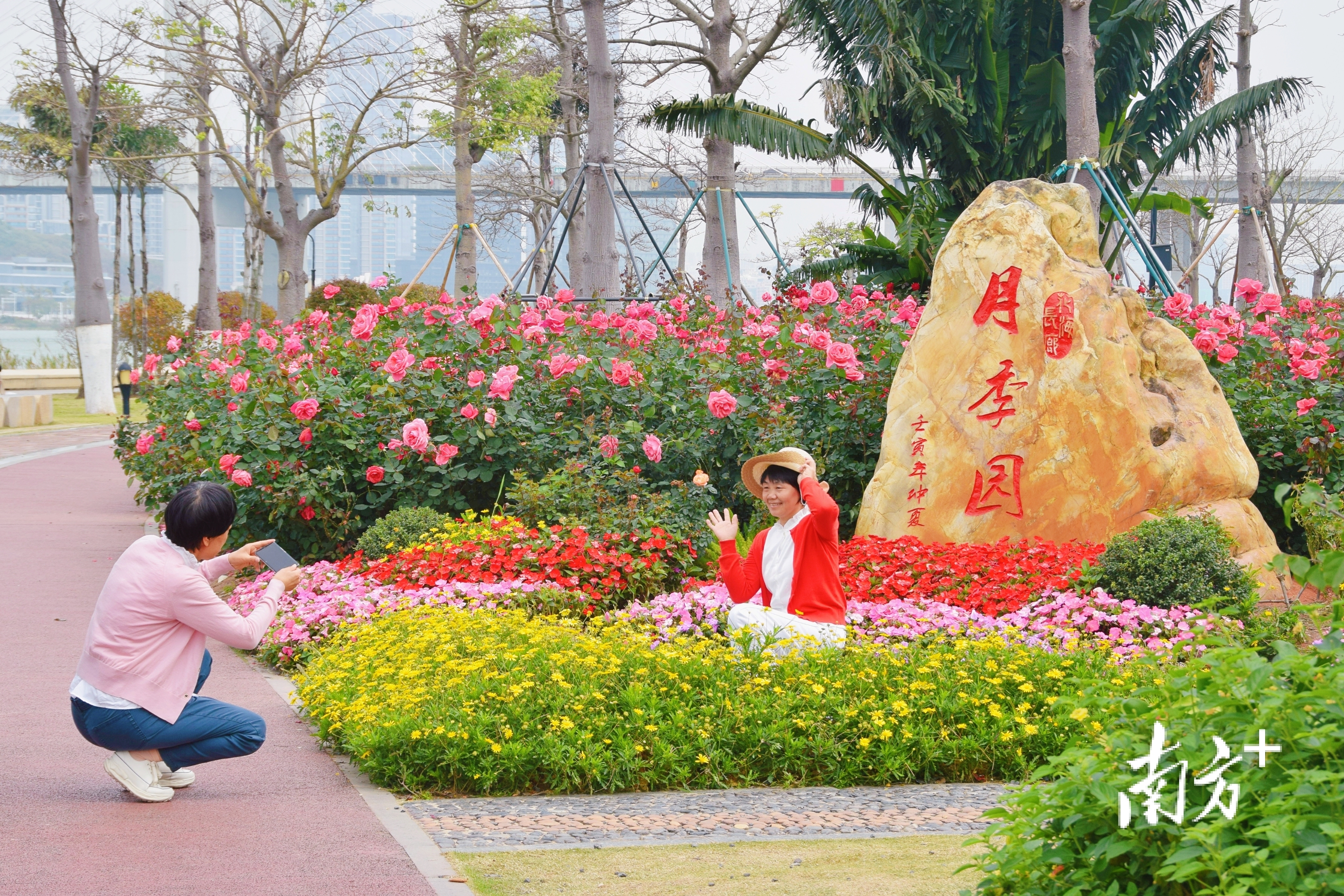 游客们蹲在花丛边拍照。 南方+ 钱文攀 拍摄